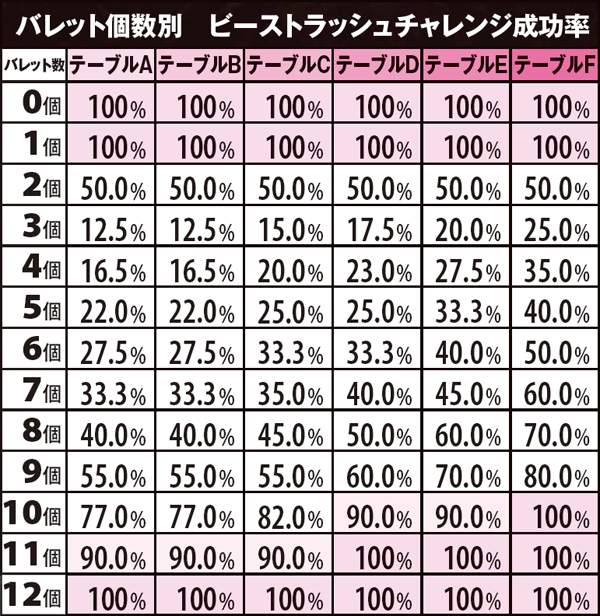ビーストラッシュチャレンジ成功率・テーブル&バレット個数別