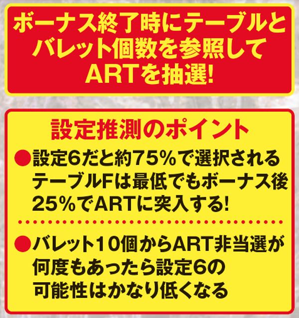 ボーナス後のビーストラッシュチャレンジからのART当選を管理するテーブルA~F選択率にあからさまな設定差がある。バレット10個獲得時にART非当選=テーブルF否定となるので、朝イチ台以外で何回も確認できてしまったら、設定6ではほぼないと考えてよい。