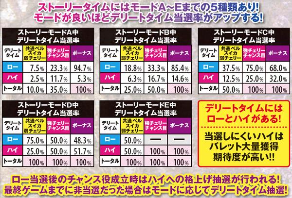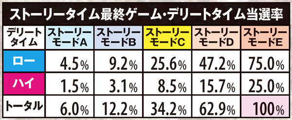 ストーリータイムにはデリートタイム突入期待度の異なるモードA~Eがある。最終ゲームまでにハイに当選した後のチャンス役はバレットの上乗せ抽選を行うので、引き損はない。ストーリー→デリート期待度は約30%だ。