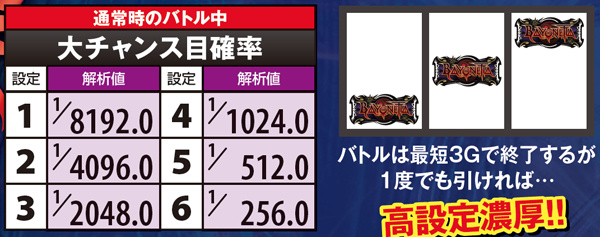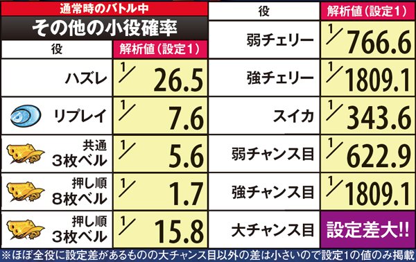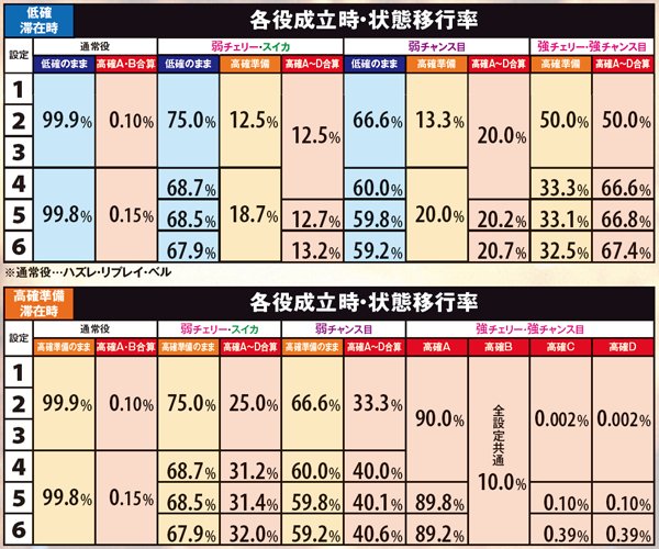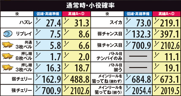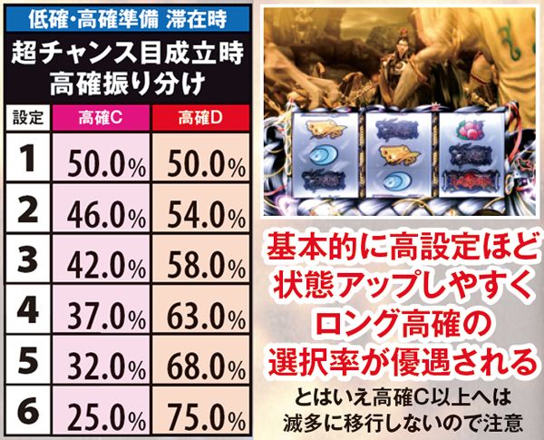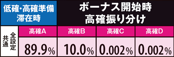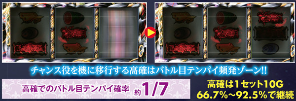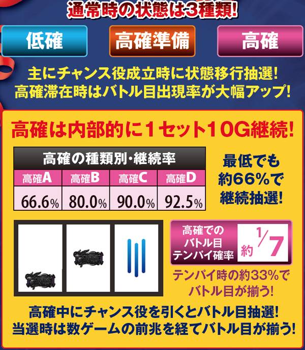 高確はA~Dの4種類。後者になるほど継続率が優遇されており、各セット終了後に継続抽選を行う。低確&高確準備中のチャンス役は状態昇格が主な役割だが、高確中に引いた場合はバトル目に期待できる。