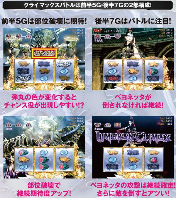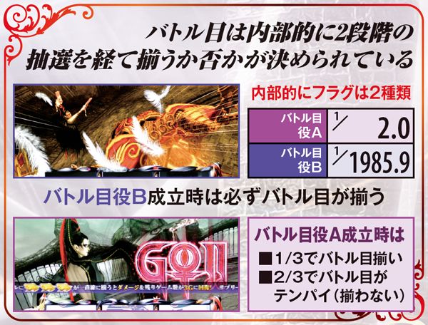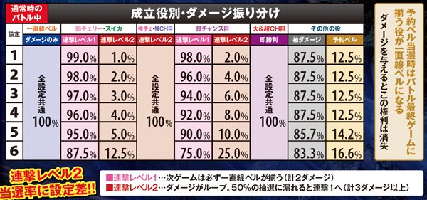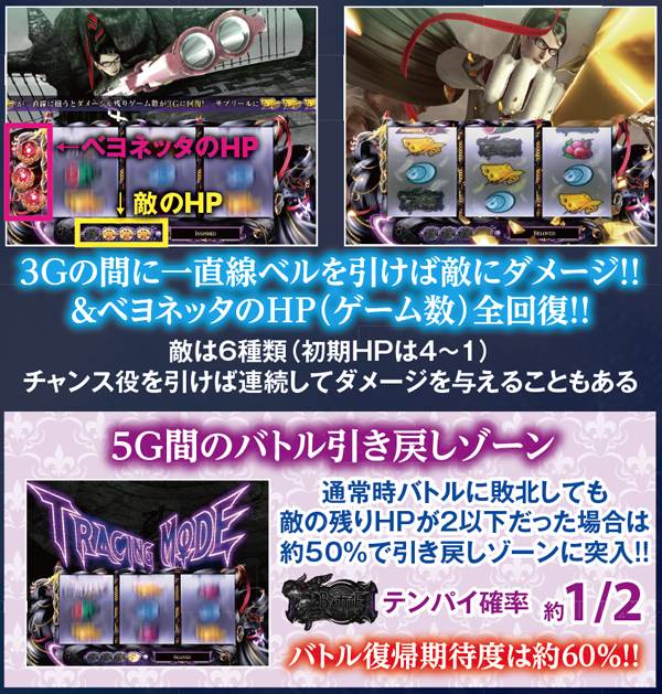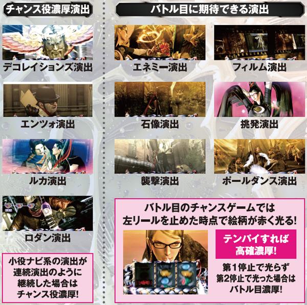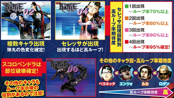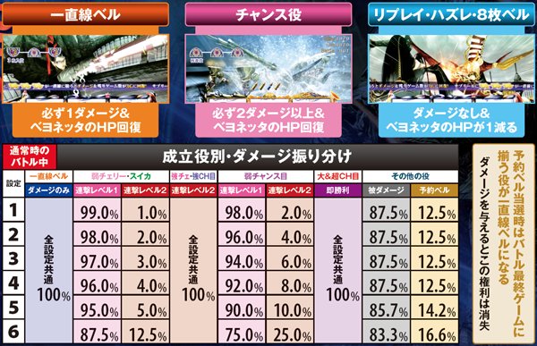 バトル中にチャンス役を引くとベヨネッタの連続攻撃が発生する。その際に上位の連撃レベルが選ばれるとダメージがループするため、連撃レベル2の選択率が優遇される高設定ほどバトルに勝利しやすくなる。中でも設定6は別格だ。