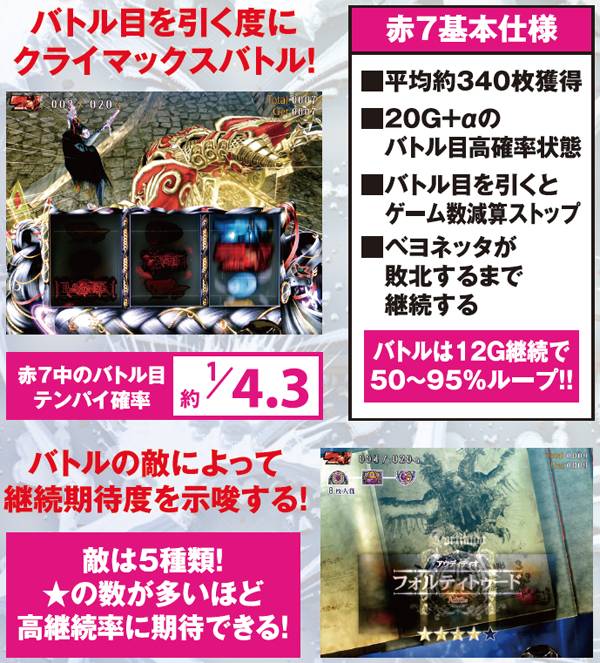 赤7は20G間のバトル目高確率状態である。バトル目を引けば必ずクライマックスバトルに突入し、ベヨネッタが負けない限りバトルがループする。継続率は最高95%となっており、敵の種類(★の数)で継続率示唆を行う。