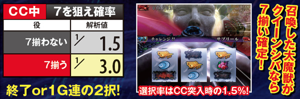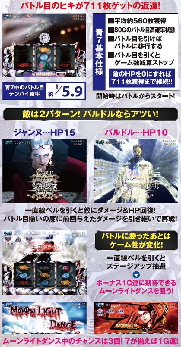 青7は80G間のバトル目高確率状態。スタート時にジャンヌまたはファーザーバルドルとのバトルに突入し、通常時と同じルールでバトルの攻防を行う。以後のバトルは敵がダメージを引き継いだ状態となり、最終的に倒せば711枚を獲得&ムーンライトダンス突入に期待できる。