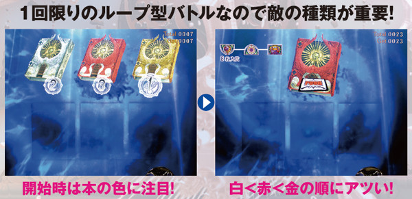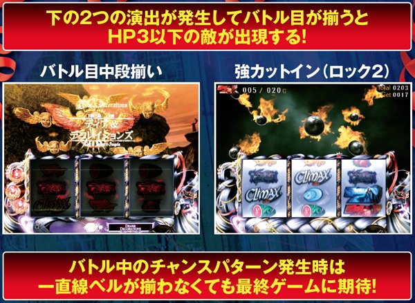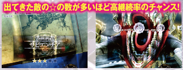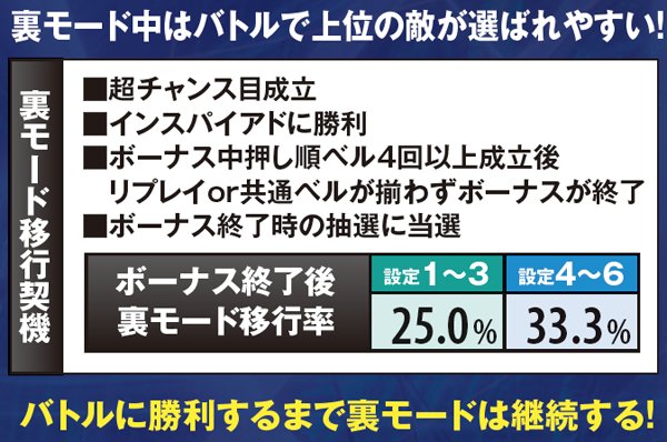 バトルは基本継続が3G。その間に一直線ベルを引けば敵にダメージ&継続ゲーム数がリセットされ、最終的に敵を倒せばボーナスが確定する。また、敵HPを2以下まで削って敗北した場合、救済措置として約50%で引き戻しゾーンに突入する。