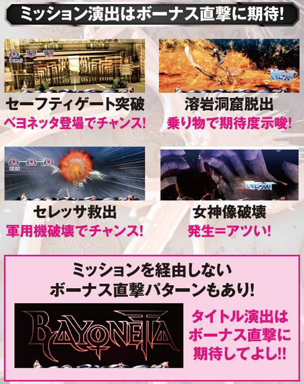 チャンスパターンは基本的に一直線ベルの期待度を示唆するが、ここでベヨネッタの攻撃が当たらなければ最終ゲームの予約ベルに期待できる。ラストの大逆転がアツい。
