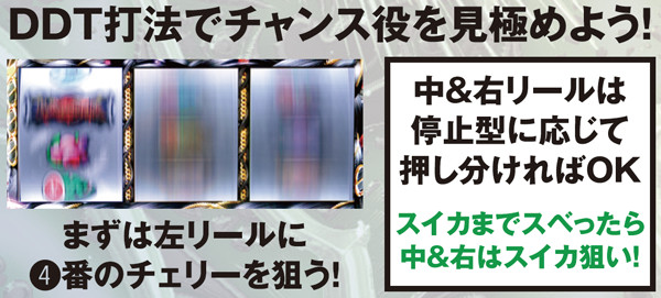 DDT手順はお馴染みのチェリー落とし。左の停止型に応じて中&右を狙い分ければOKだが、取りこぼしても損はない。なお、強系のチャンス役が出現すれば直撃ボーナスに期待できる。