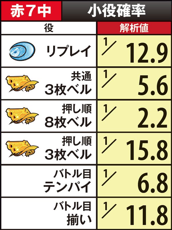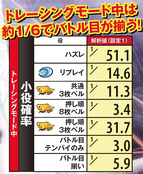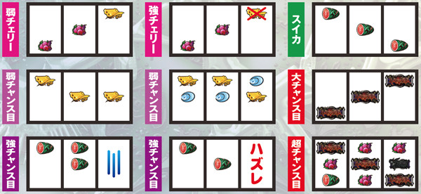 演出用リールの入賞役はメインリールと必ずしも一致しないため、チャンス役に前兆が絡んだりバトル目テンパイが連続することもある。これらのパターンを覚えておけば通常時をアツく楽しめる。