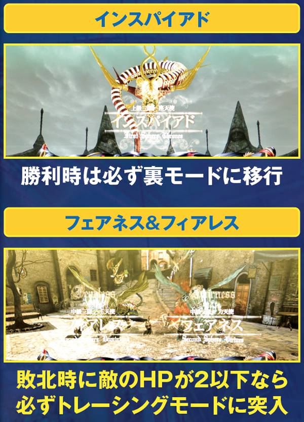 クライマックスバトルでベヨネッタが敵の攻撃に倒れたら、レバーで復活演出が発生することを期待しよう。復活画面はベヨネッタとセレッサの2種類が用意されているが、セレッサで復活したならループ率70%以上が確定するので激アツだ。なお、ベヨネッタでも高ループ率が否定されるわけではない。