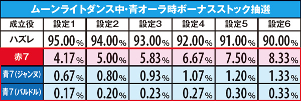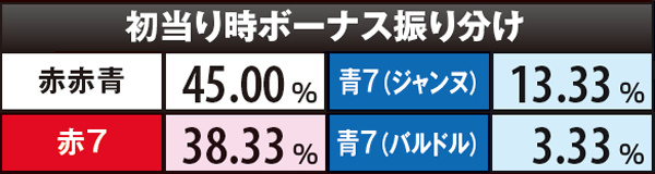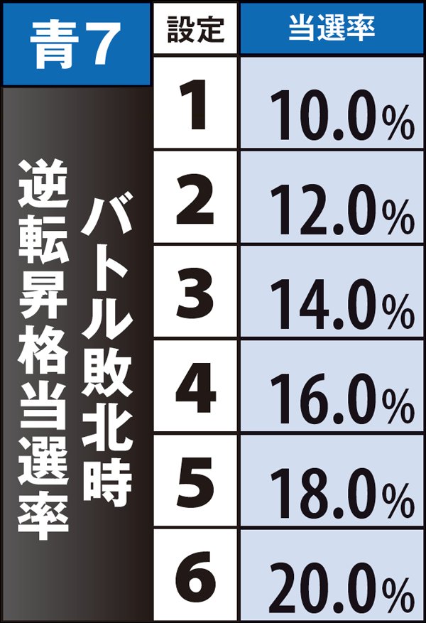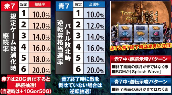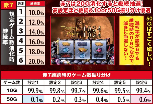 赤7および青7終了時は上記のような抽選が行われ、これに当選すると終了画面で示唆演出が発生する。高設定ほど当選率が上昇するので、サンプルが集まれば設定推測要素となる。