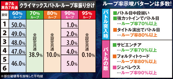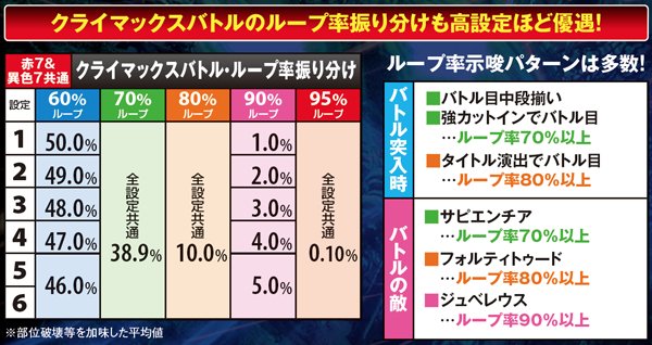 クライマックスバトルのループ率振り分けには上記のような特徴がある。低設定ほど60%ループの選択率が高く、逆に高設定になるほど90%ループが選ばれやすい。他のループ率の選択率は全設定共通だが、結果的に高設定ほどクライマックスバトルの平均出玉が多くなるのだ。