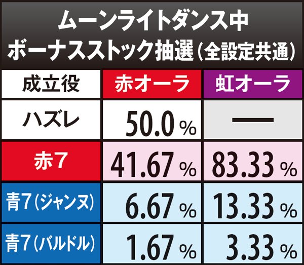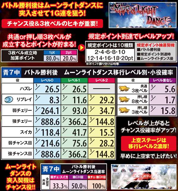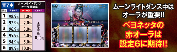 共通or押し順3枚ベルで規定ポイントに到達するとレベルアップが発生。ムーンライトダンスの契機はチャンス役につき、チャンス役確率がアップする上位レベルほど1G連期待度も高くなる。ムーンライトダンス中はベヨネッタのオーラにも要注目だ。