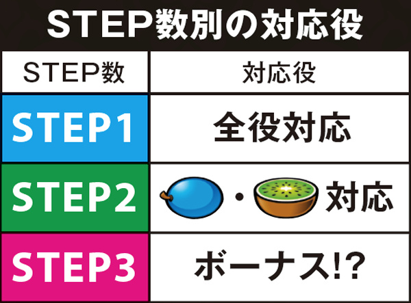 ショートフリーズにはSTEP1~3と3つの段階がある。STEP1は全役対応、STEP2だと対応役がプラムとキウイに絞られる。もしSTEP3まで進めば大チャンス到来。対応役はボーナスだ。