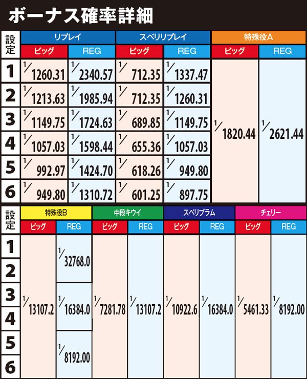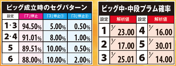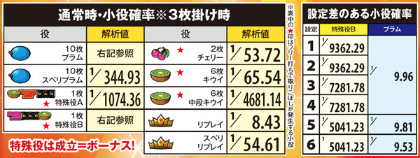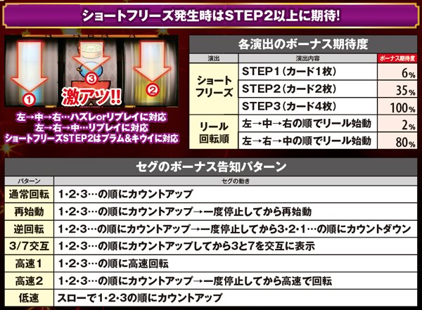 本機はショートフリーズとリール変則始動の2パターンを採用しており、これらが絡めばチャンスアップ。ショートフリーズ・ステップ2はプラム&キウイ対応となっており、ここで小役がハズれればボーナスが約束される。なお、セグは通常回転以外ならばビッグの期待大だ。