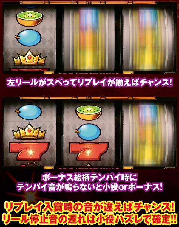 レバーON後はリール回転の仕方に注目。通常回転以外の対応役は主にリプレイだが、リプ連がアツい仕様ゆえ、もしリプ連時に発生したらボーナスが成立している可能性が高まる。