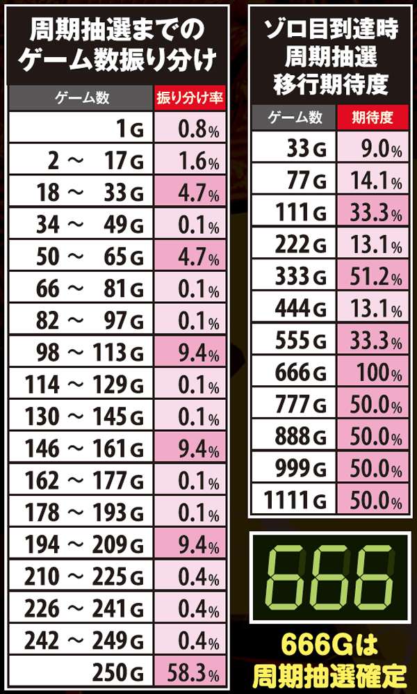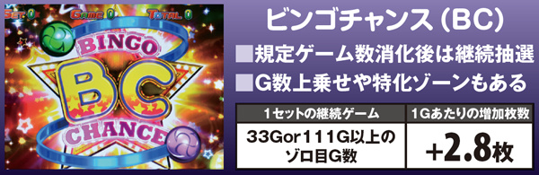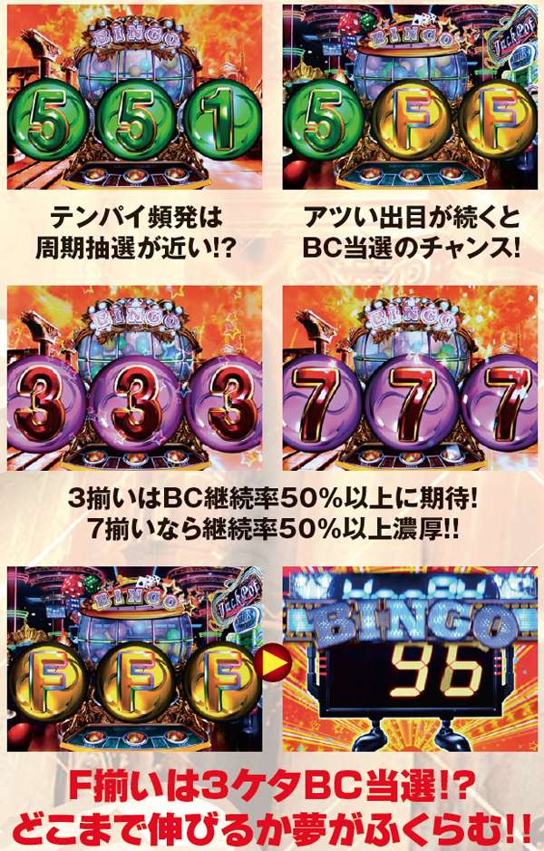 前作で約1/25だった3ケタBCの当選率は倍以上の約1/12に。もちろん全ての7揃いに3ケタの可能性があるので継続演出なども灼熱だ。