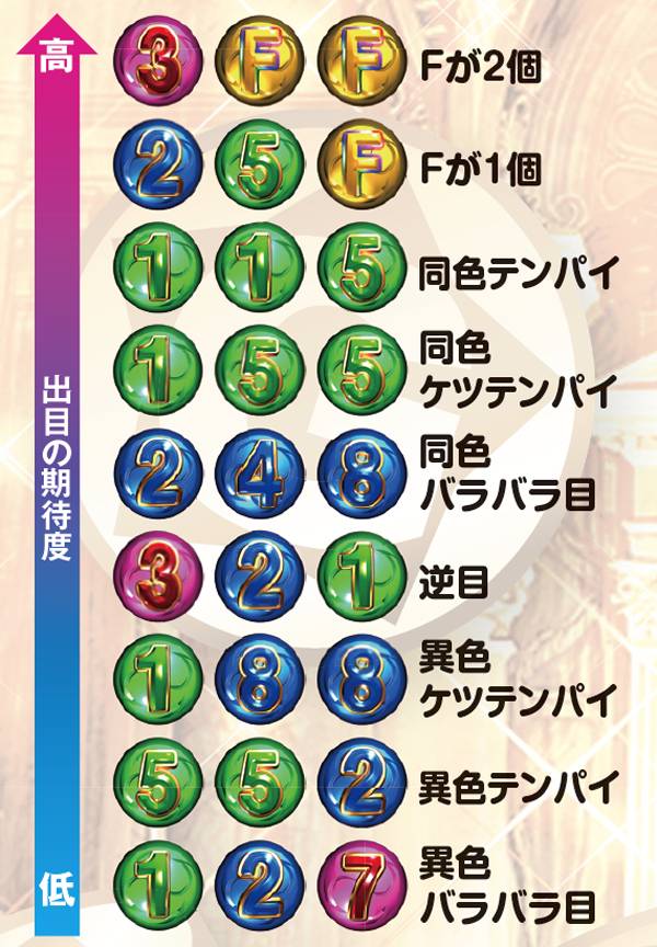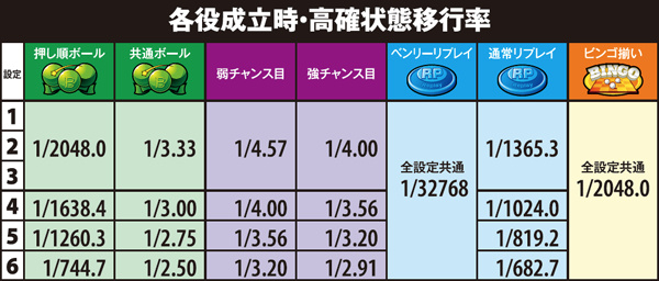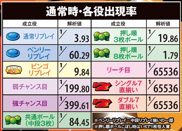 本機は取りこぼす役がないので通常時はフリー打ちでOKだが、弱&強チャンス目成立時は周期抽選までのゲーム数が0まで短縮される可能性があるので、見逃さないよう停止型を覚えておこう。