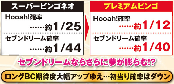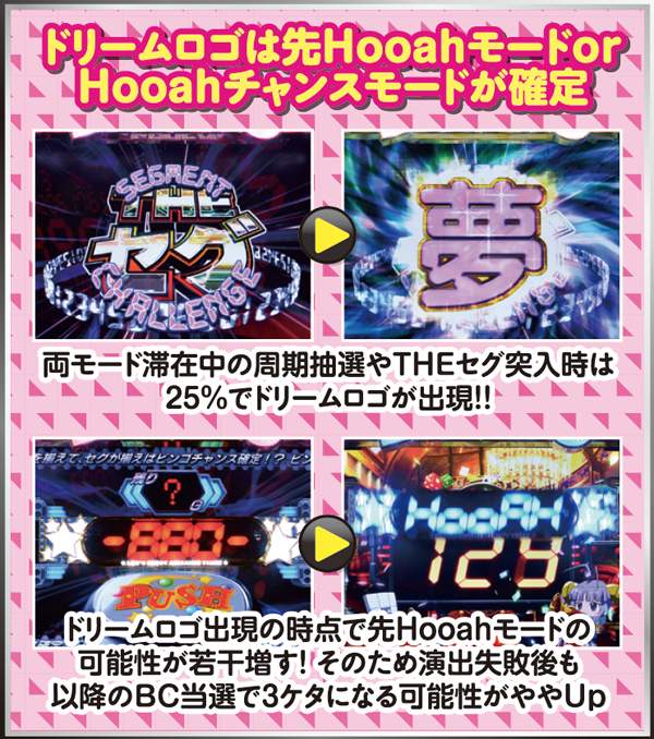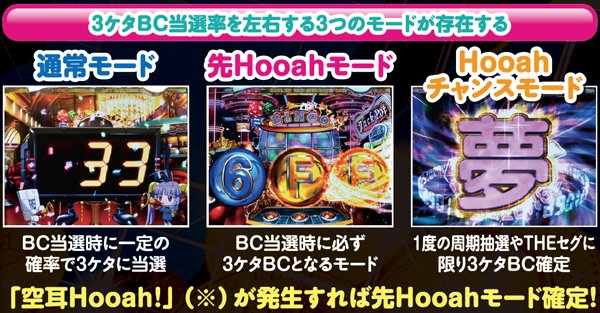 BC当選時にあらかじめ3ケタBCが確定するHooah確定モードは今作も2種類用意されている。Hooah確定モードが約束されるドリームロゴや空耳Hooah!は激アツだ。