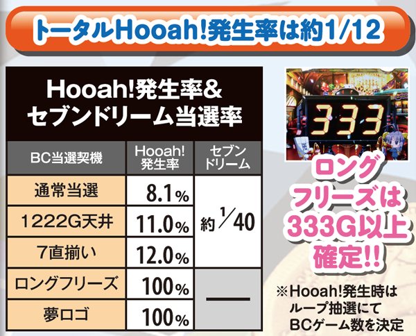 7揃い時にセブンドリームとなったら、その後の展開に注目しよう。セブンドリーム中の7揃い時もHooah!抽選を行うので、確率が上がった今作なら複数Hooah!ゲットも夢ではない。
