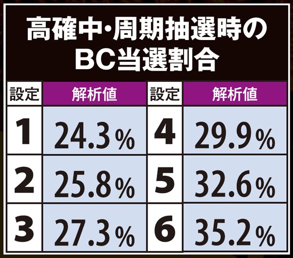通常時の高確移行率は前作と完全に同一。高確中はTHEセグ当選率と周期抽選でのBC当選率が優遇され、「メッセージ受信中」画面へと移行しやすい傾向がある。