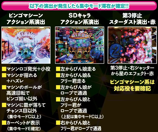 前作から完全継承されている部分は数値面に留まらず、演出にも当てはまる部分が多い。特にカコミ内の「集中モード中の演出法則」は前作と寸分変わらぬ内容となっているので覚えておこう。