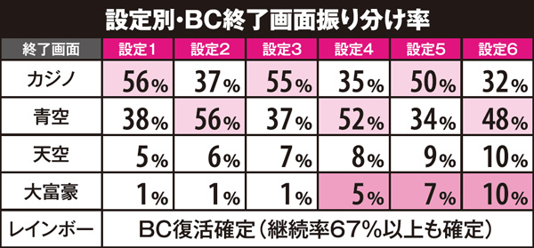 BC終了画面は全部で5種類あり、この中で設定推測要素として最も強いのは「大富豪」。低設定では1%の割合でしか選ばれないが、高設定では5〜10%の割合で選ばれるので要注目だ。