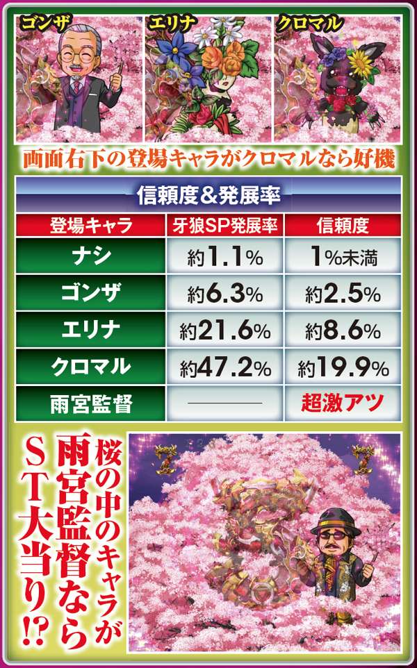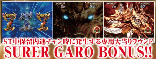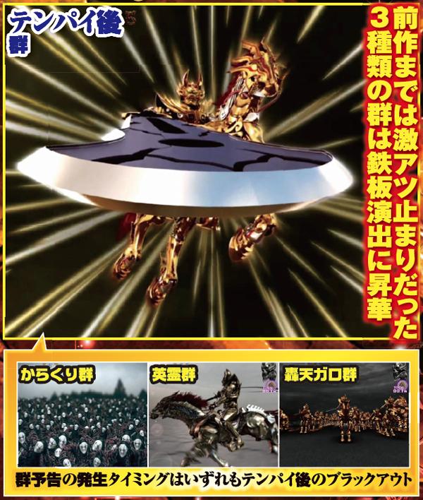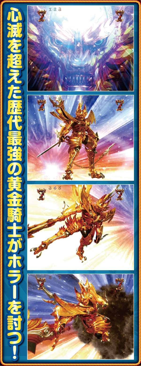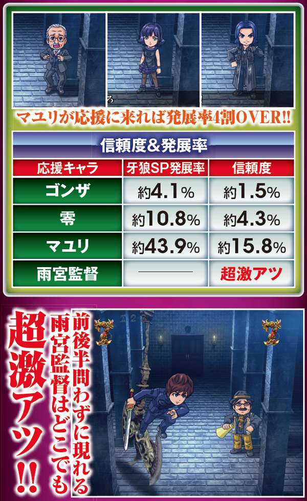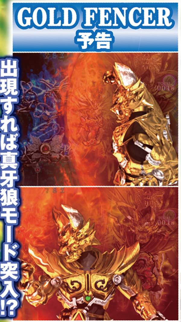 スペックは『金色になれ』の連チャンシステムを踏襲しているが、前作よりもヘソの確変割合が2%アップ。 新アクションも多数搭載しており、よりパワーアップしている。本作では、牙狼の強化した姿が現れるとチャンスが拡大するのも大きな特徴。 ST161回転の連チャン率は約77.1%だ。 |
