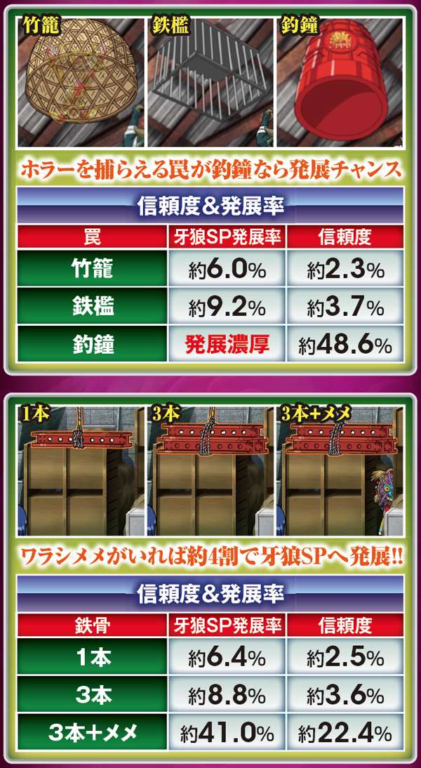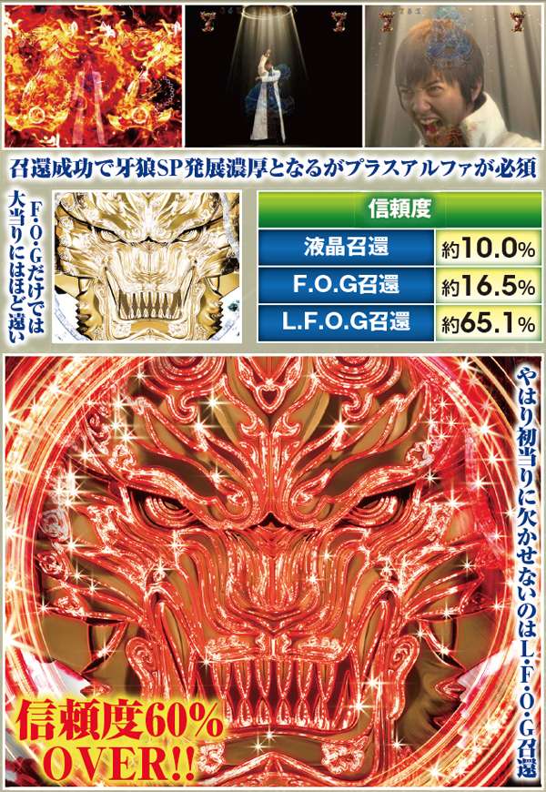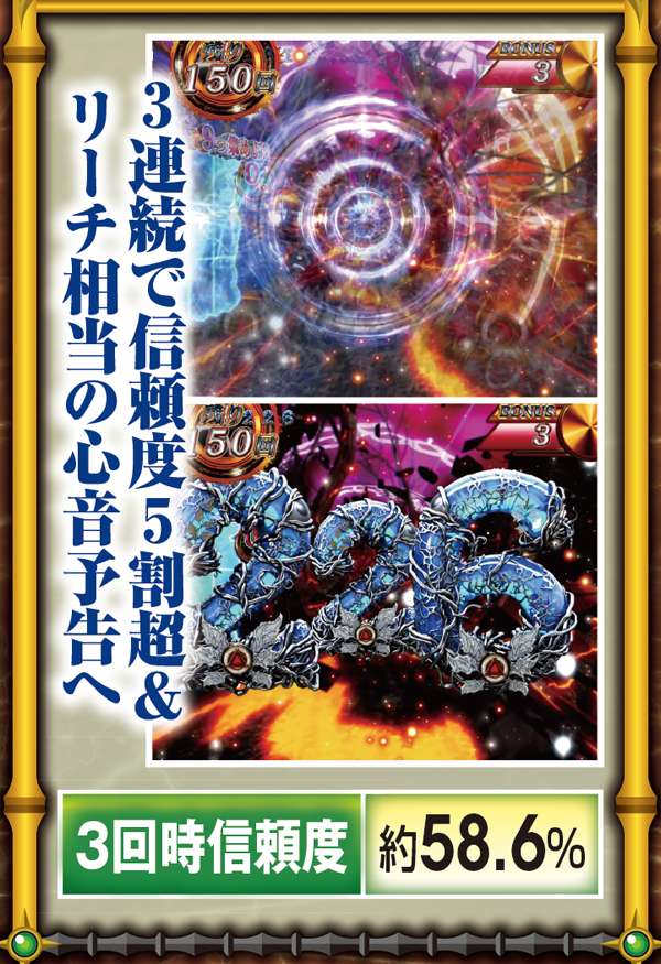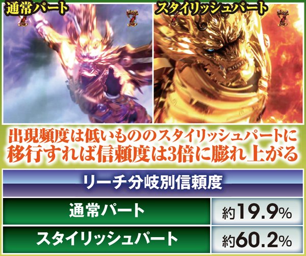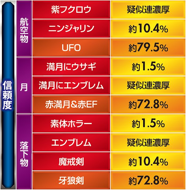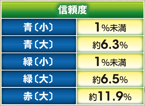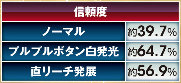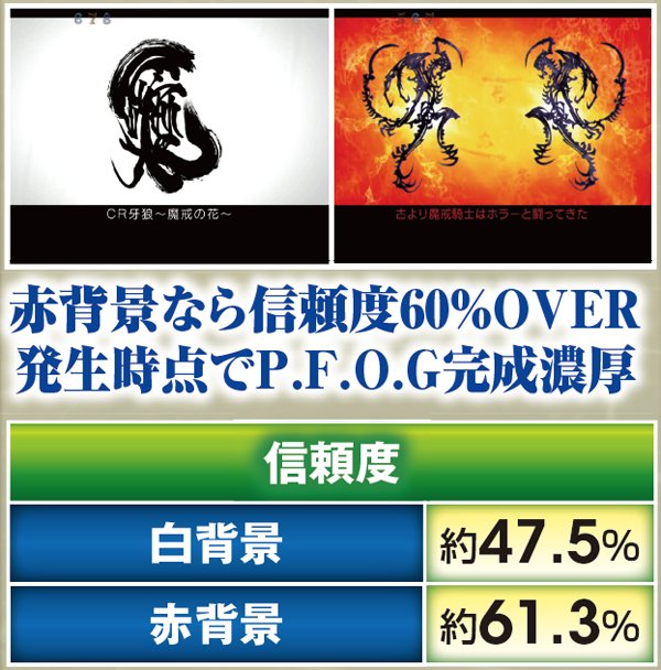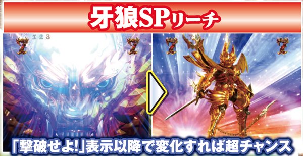 牙狼SPが書き換えられている状態なので、信頼度は1〜6割と振れ幅が大きい。全ての牙狼SPの可能性があるため、現時点で判別法はない。そのため、リーチ発展前までの予告がより重要となる。ちなみに、リーチ秒数は99.9秒ではない。