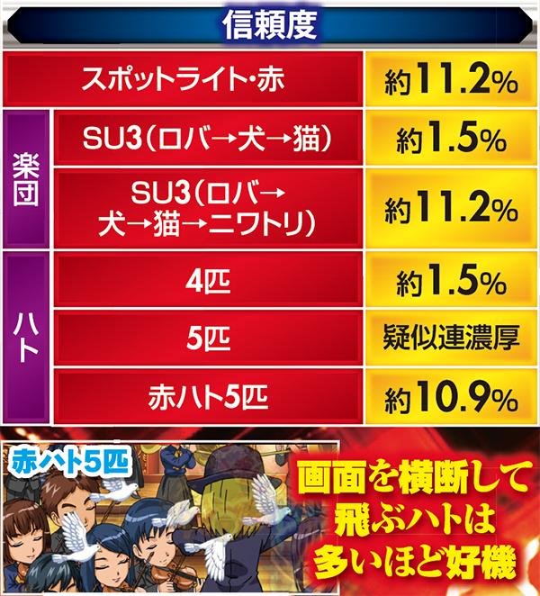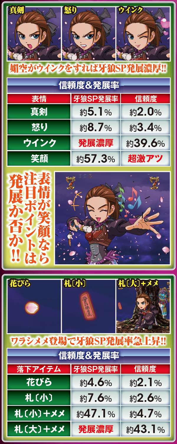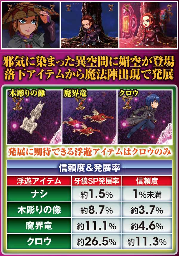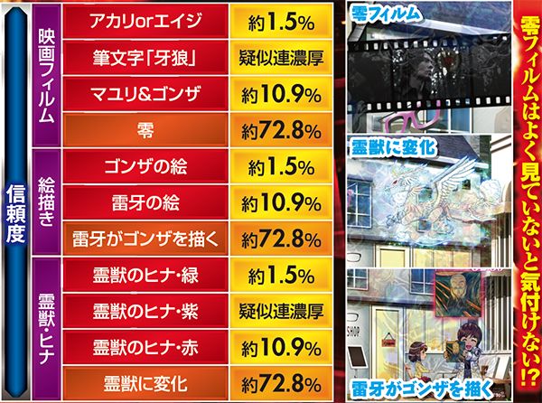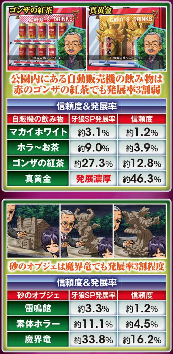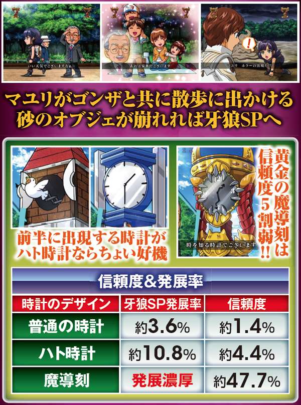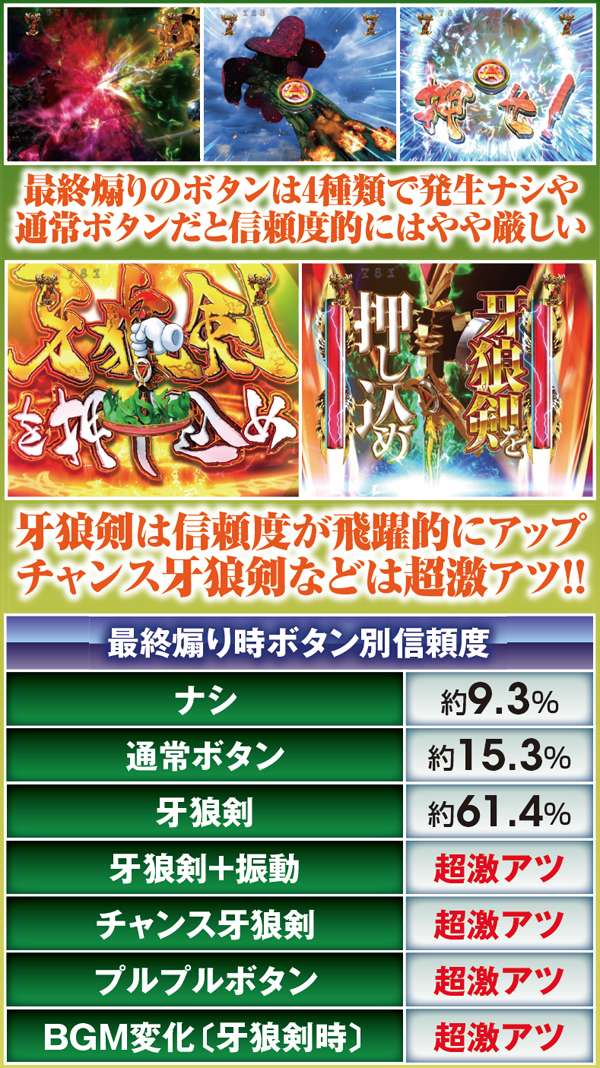 牙狼SPが書き換えられている状態なので、信頼度は1〜6割と振れ幅が大きい。全ての牙狼SPの可能性があるため、現時点で判別法はない。そのため、リーチ発展前までの予告がより重要となる。ちなみに、リーチ秒数は99.9秒ではない。