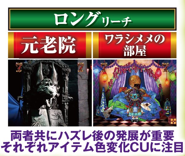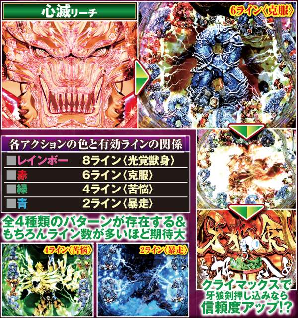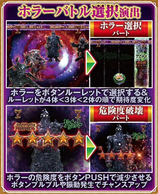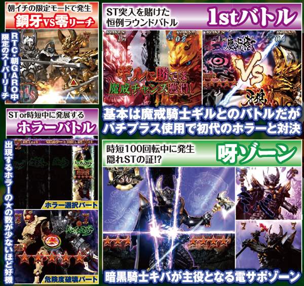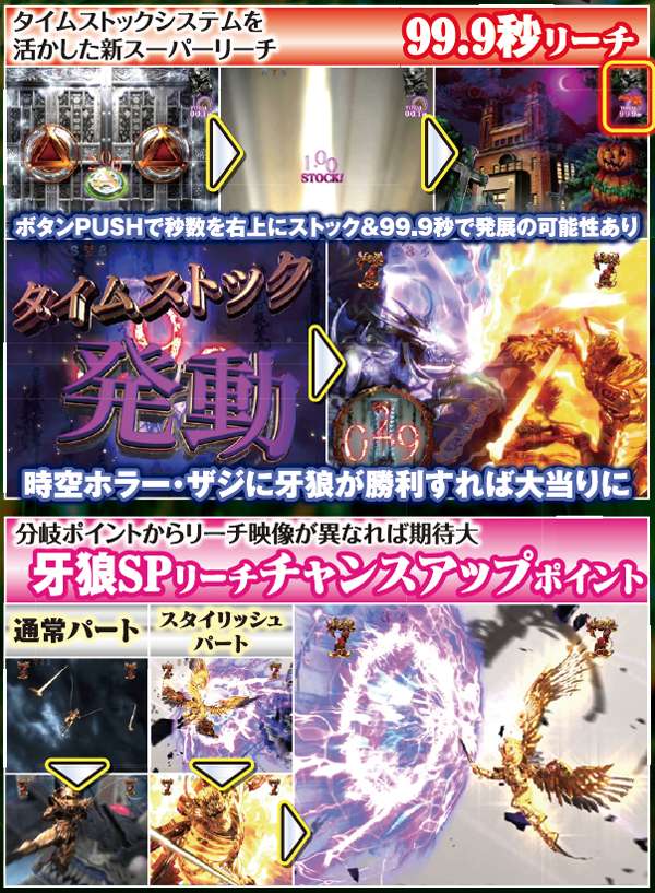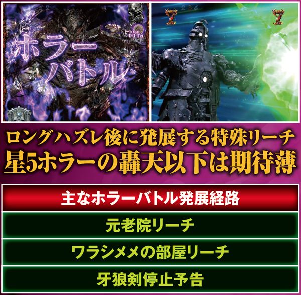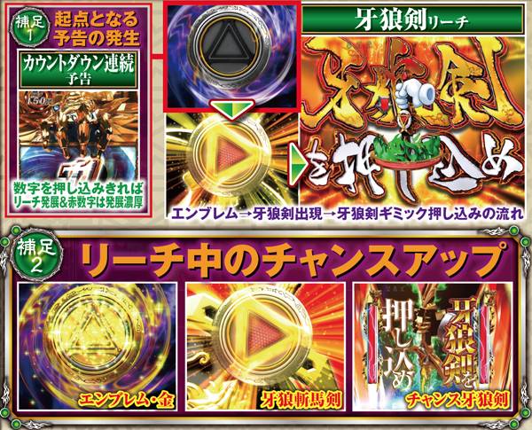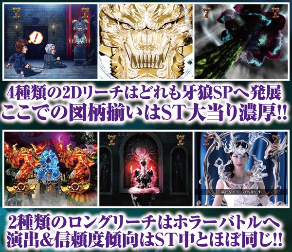 基本的に2Dリーチは牙狼SPの、ロングリーチはホラーバトルの呼び水となる。どちらも進行中のボタン振動発生で発展の大好機となる。