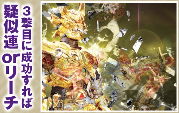 牙狼の攻撃が3回ヒットしたら疑似連orリーチへ。攻撃の際のボタン振動を伴えばチャンスアップとなる。