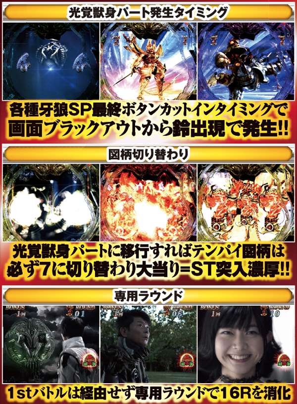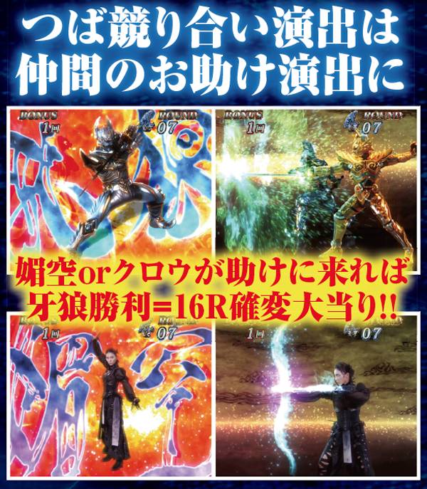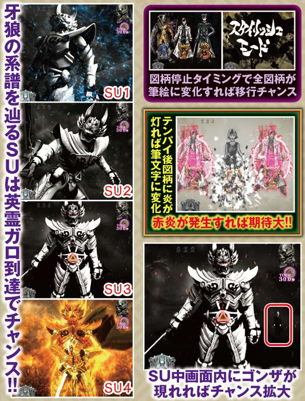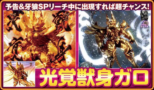 タイトル色で期待度が変化する「牙狼SP」には、通常の対戦ルートに加え、牙狼が「光覚獣身」化する大チャンスの「スタイリッシュパート」が新規搭載された。