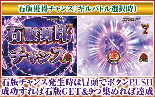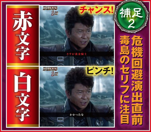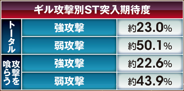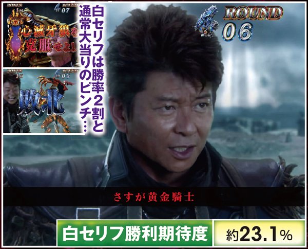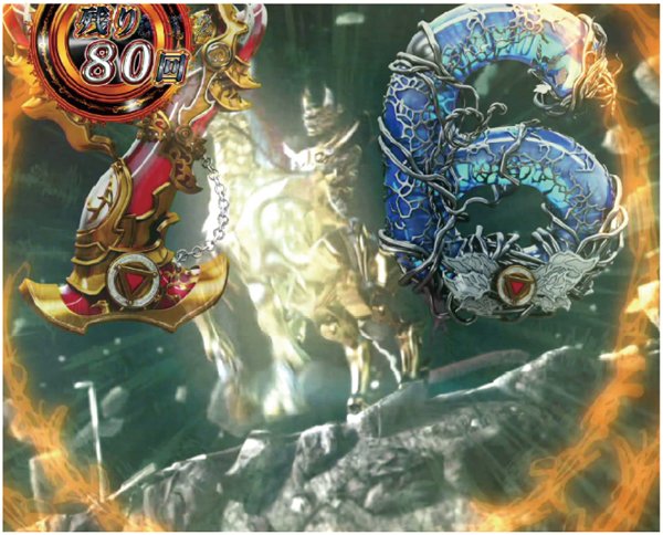 つば競り合い後のギルのセリフが白だとST期待度は2割強と敗北のピンチ。だが、赤セリフやここでボタンバイブが発生すれば状況は一転、ST突入濃厚となる。