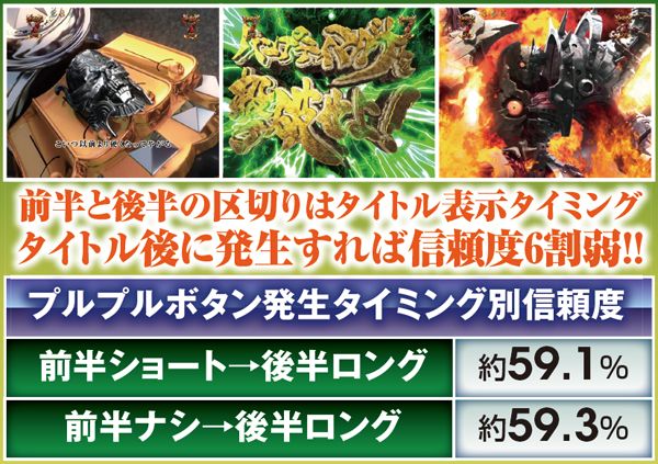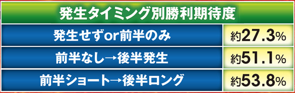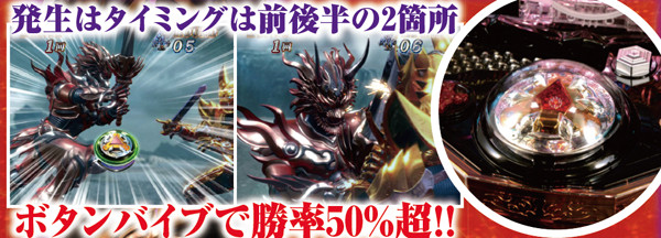 バトル勝利への重要なチャンスアップとなるボタンバイブの発生タイミングは前後半の2箇所。前半ショートバイブのみだと勝率に影響はないが、後半に発生すれば勝利期待度は50%を超えてくる。