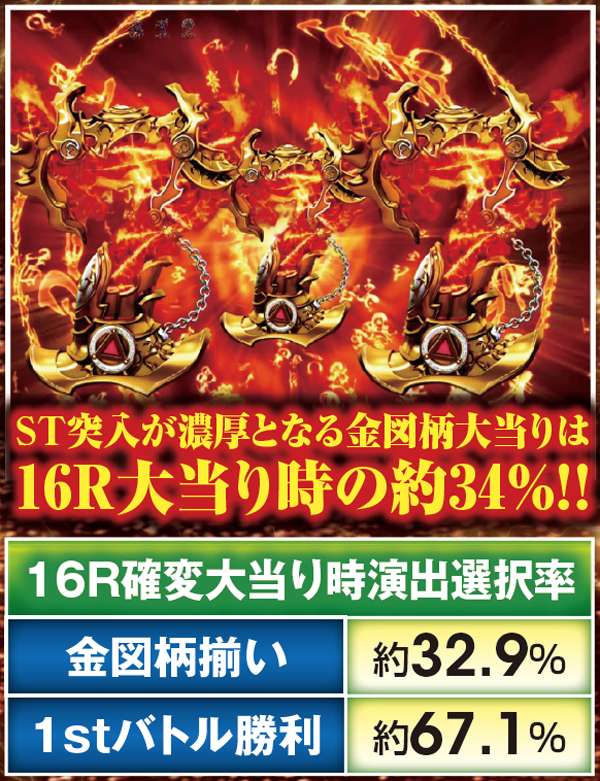 ヘソ大当り38%の16R大当りを引いた際に金図柄が揃うのは約33%。レアパターンというほどではないが、やはり1stバトル勝利がST突入の王道パターンと言える。
