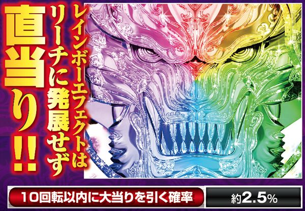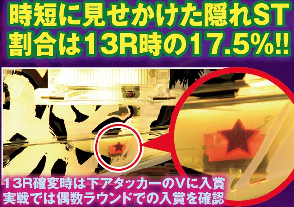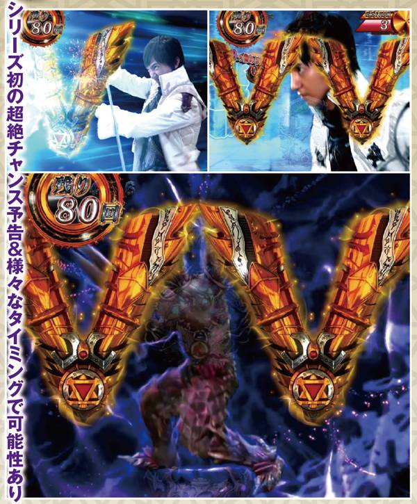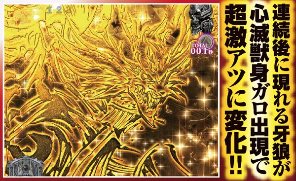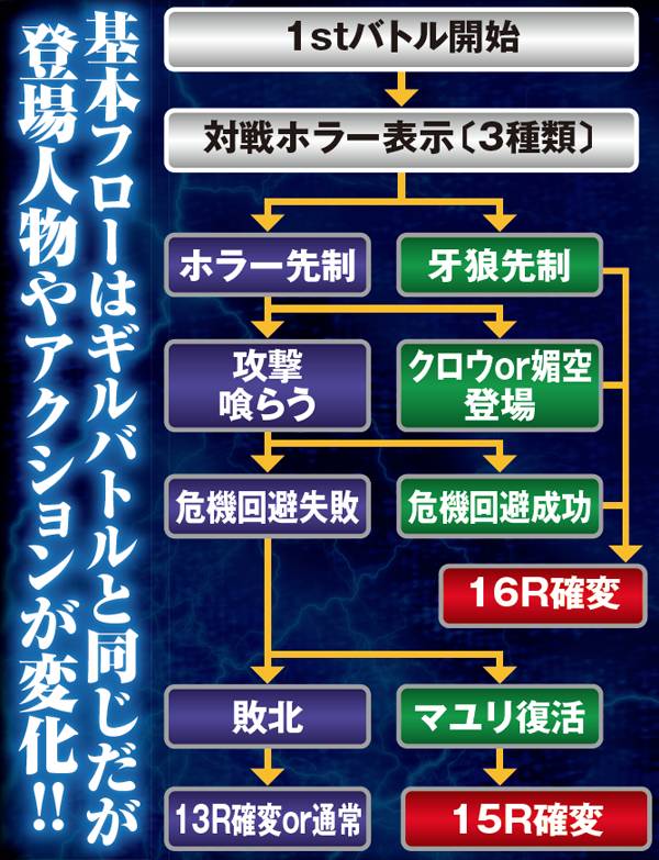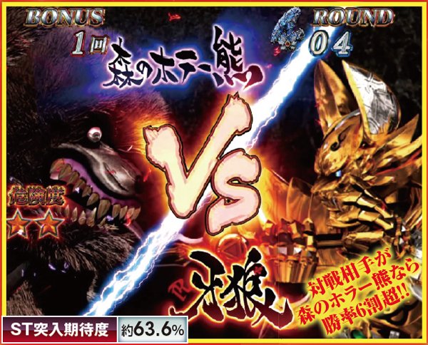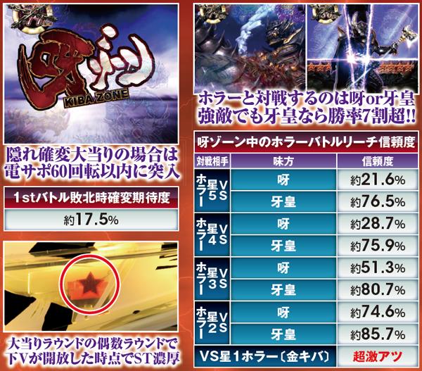 ラウンド中にV入賞したにも関わらず実質13Rで終了となれば隠れSTへと突入し、60回転以内に「呀ゾーン」へと移行する。モード専用演出となるホラーバトルは牙皇出現で大チャンスだ!