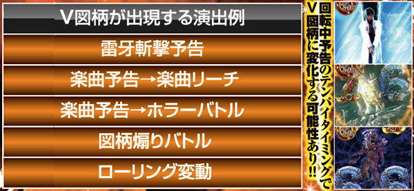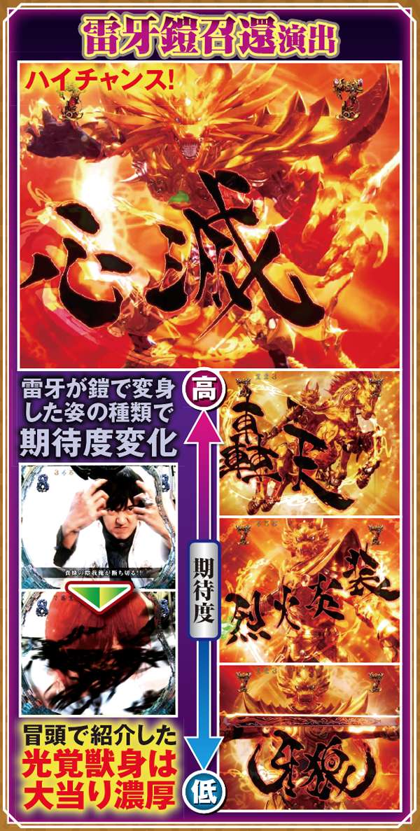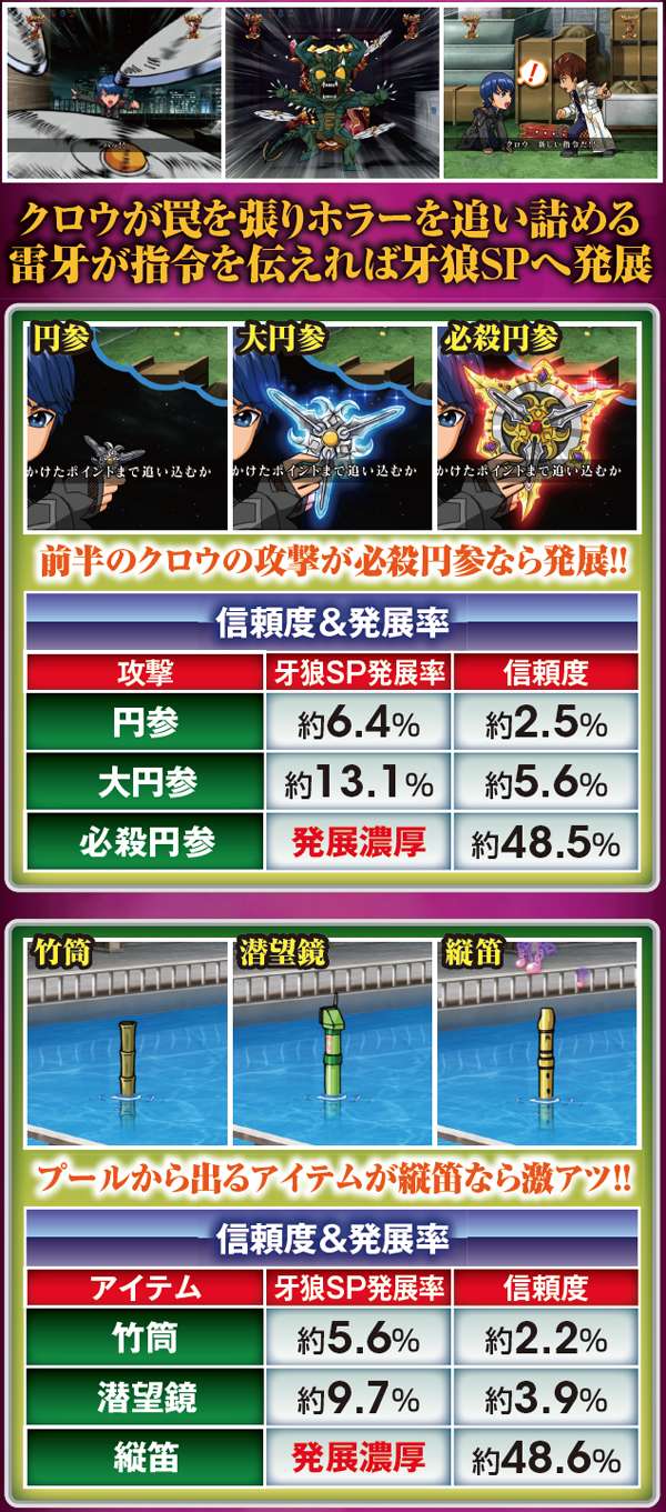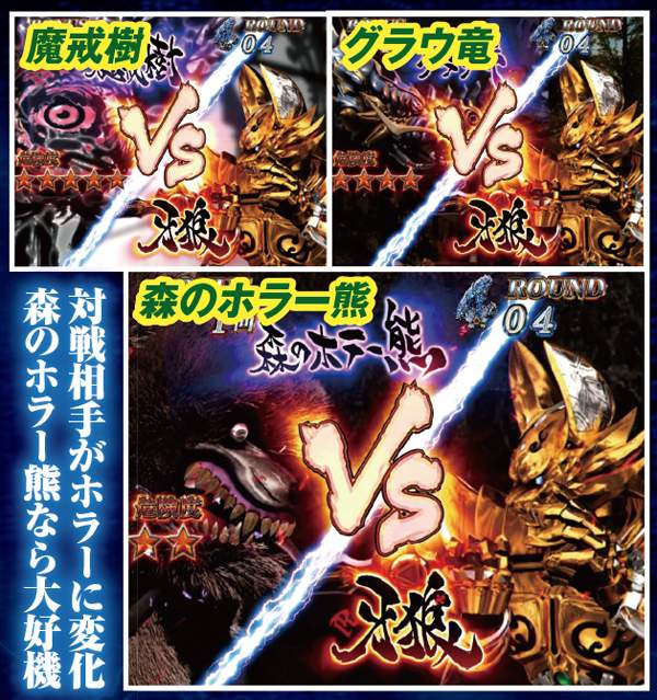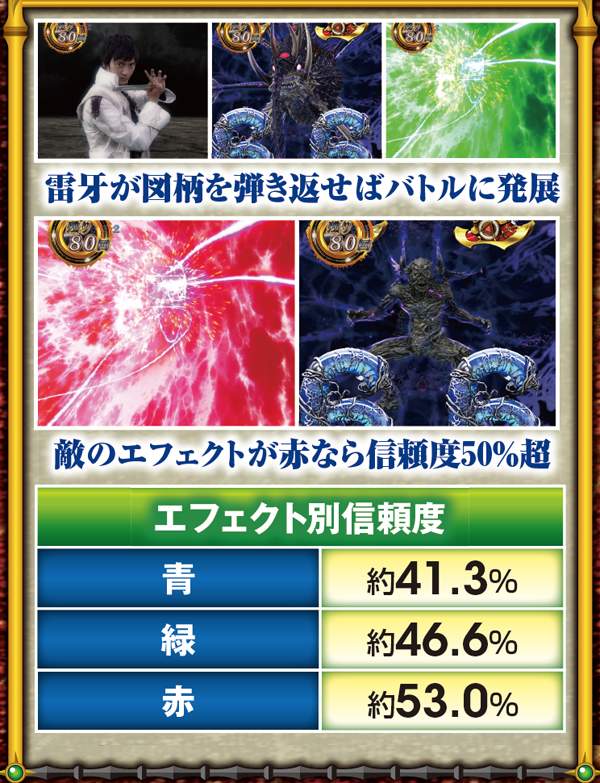 ホラーが放つ攻撃を雷牙が弾き返せばバトル発展。上記はあくまで大当り期待度なので、青や緑ではガセもままある。