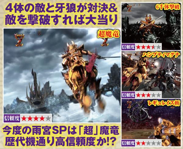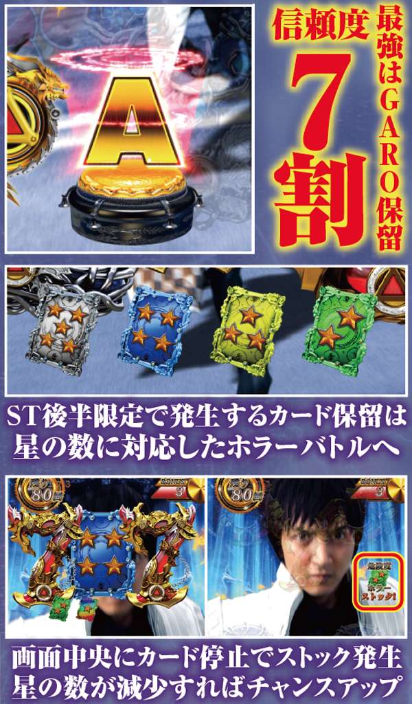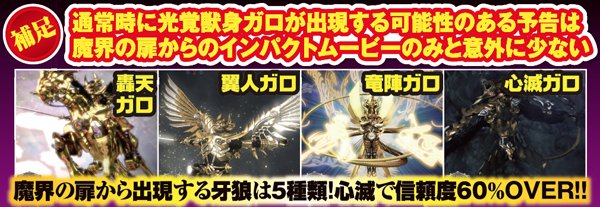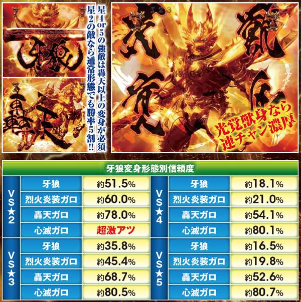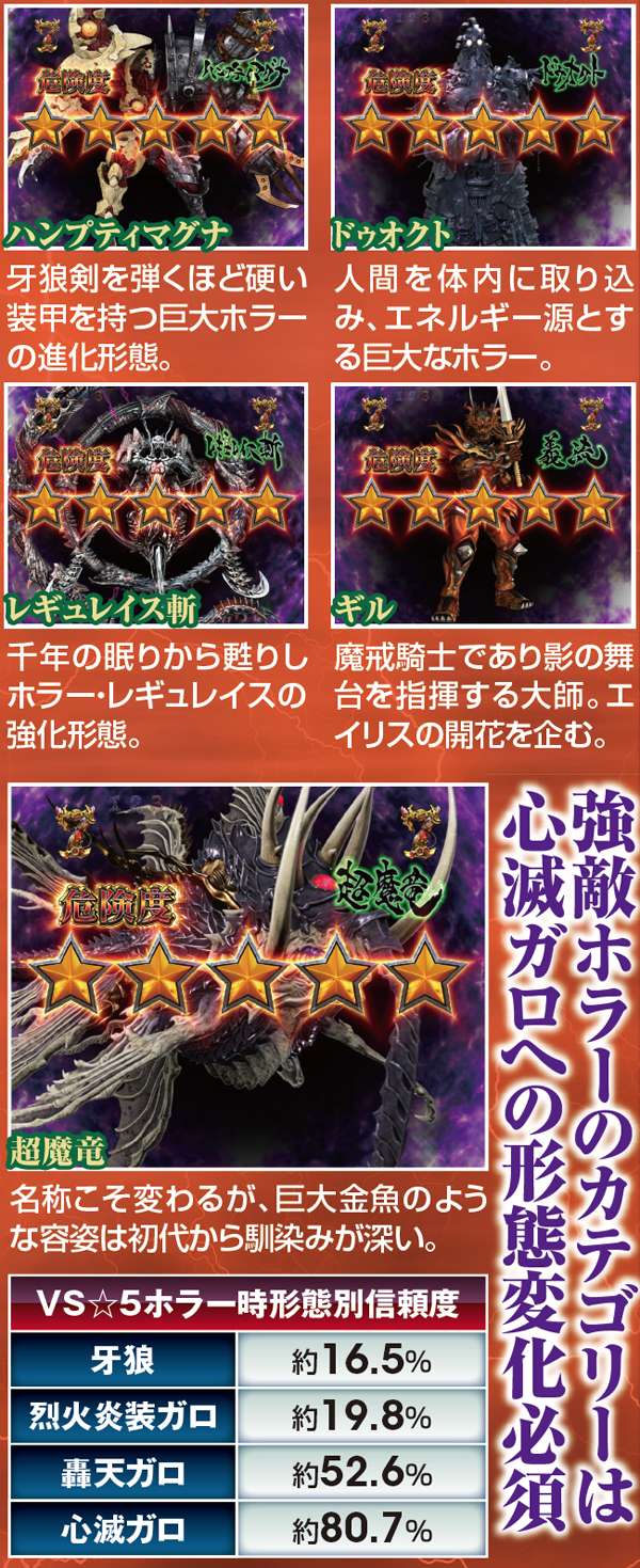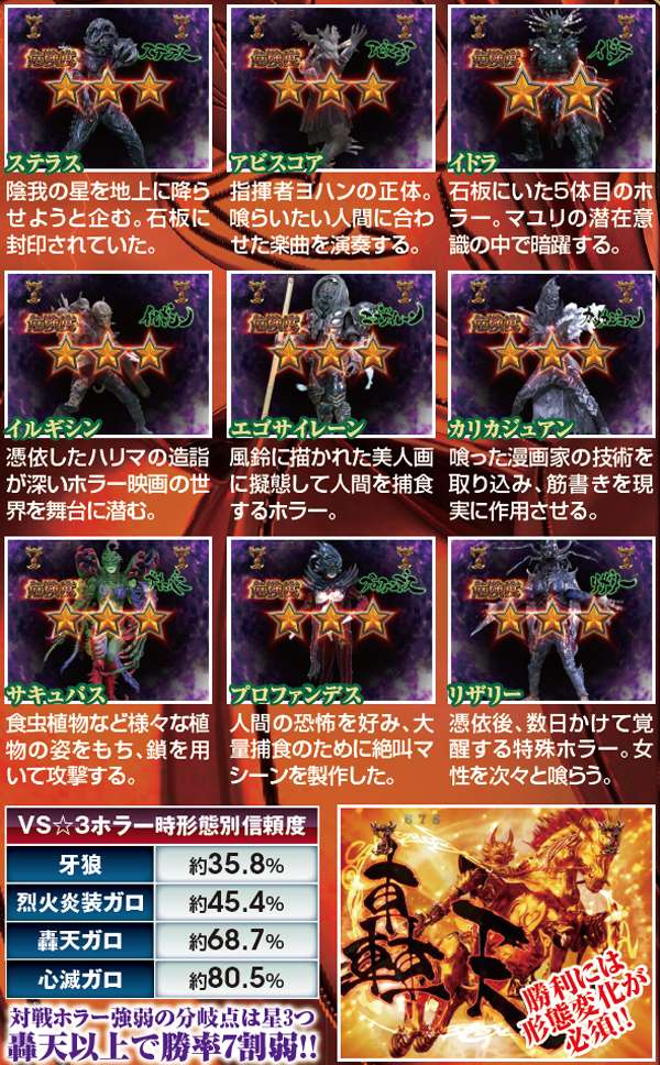 敵ホラーの星数がバトル最初の要所となるため、星を破壊する導入パターンならばチャンス。次に牙狼の形態が重要となるが、心滅獣身ガロなら星×5の強敵でも勝率80%と絶大なる信頼度を誇る。