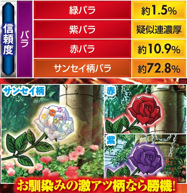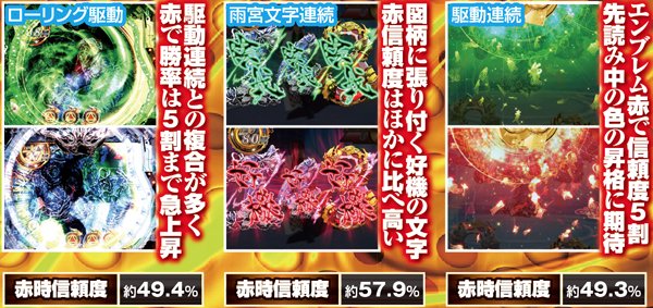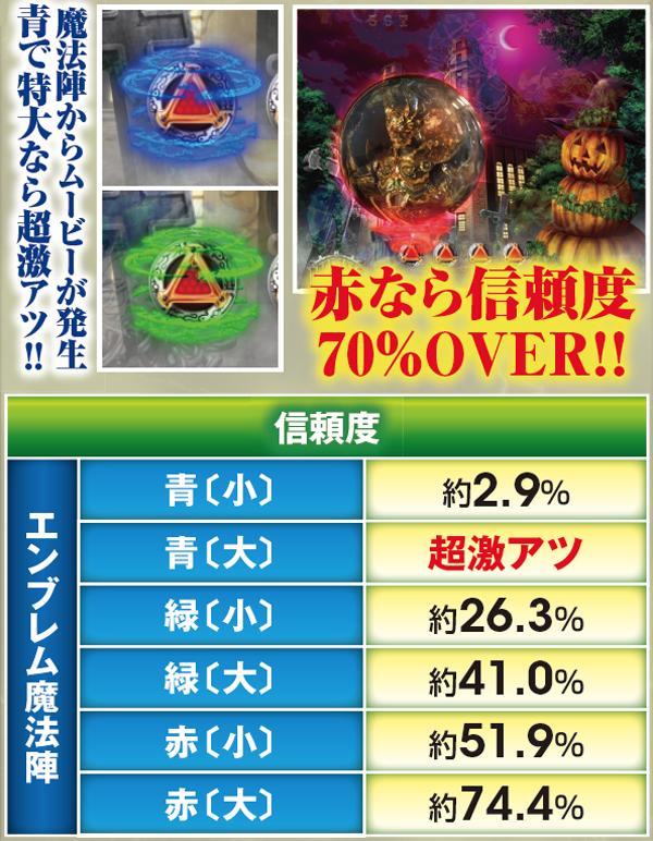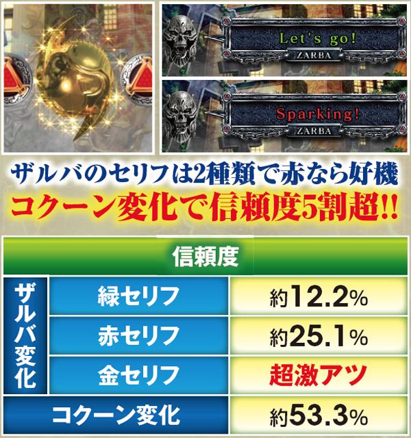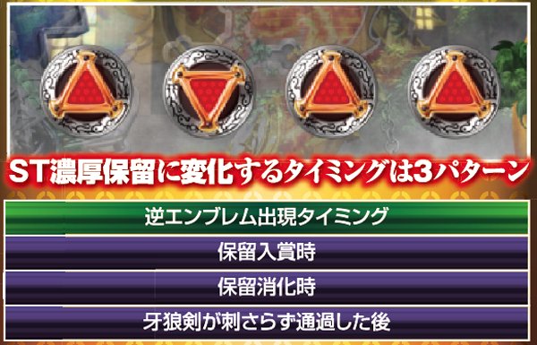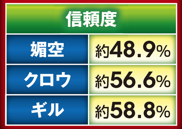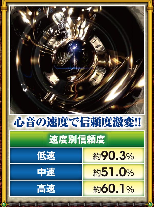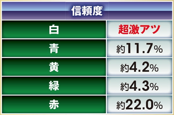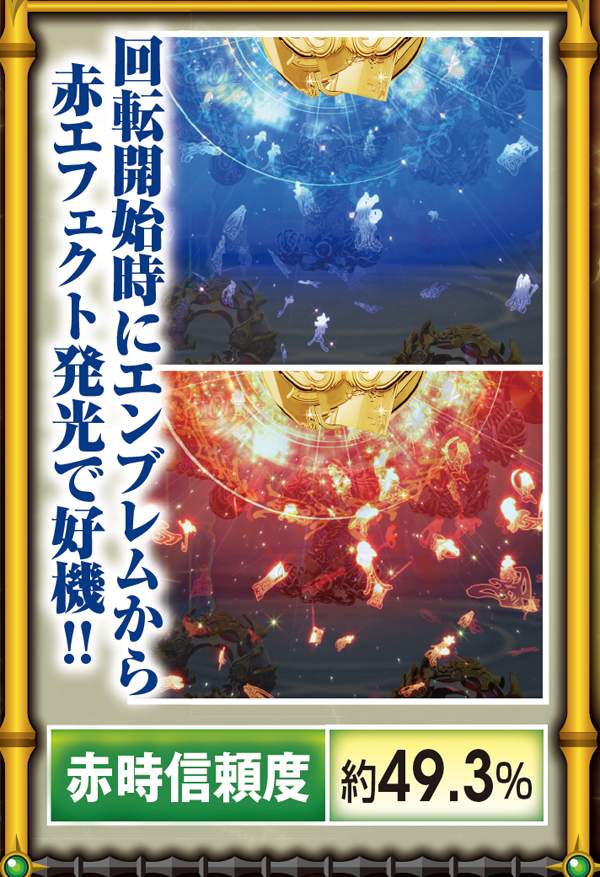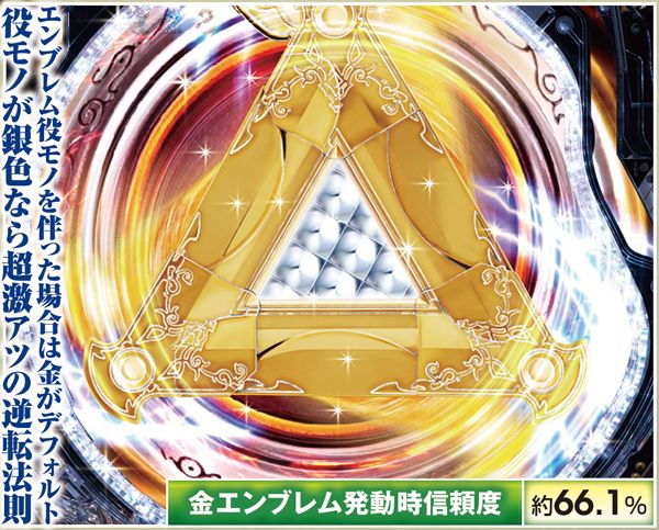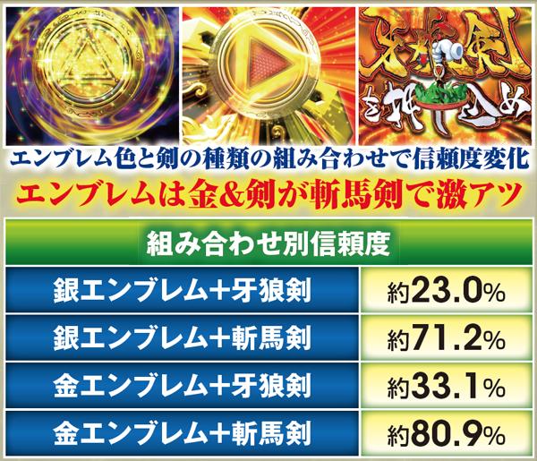 エンブレムの種類+剣の種類の組み合わせで信頼度が激変。エンブレム役モノが連動した際は、金色がデフォルトとなり、信頼度は約6割。この際、銀エンブレムならプレミアムパターンだ。