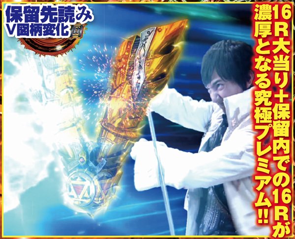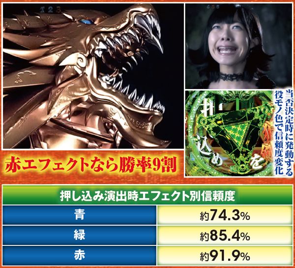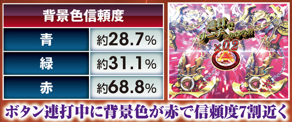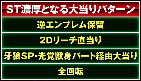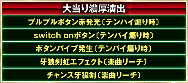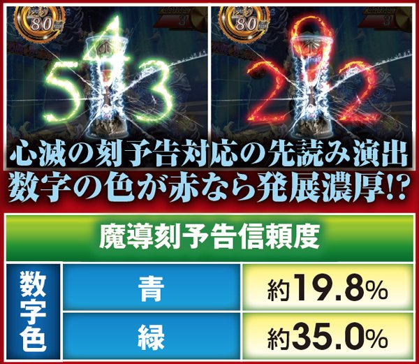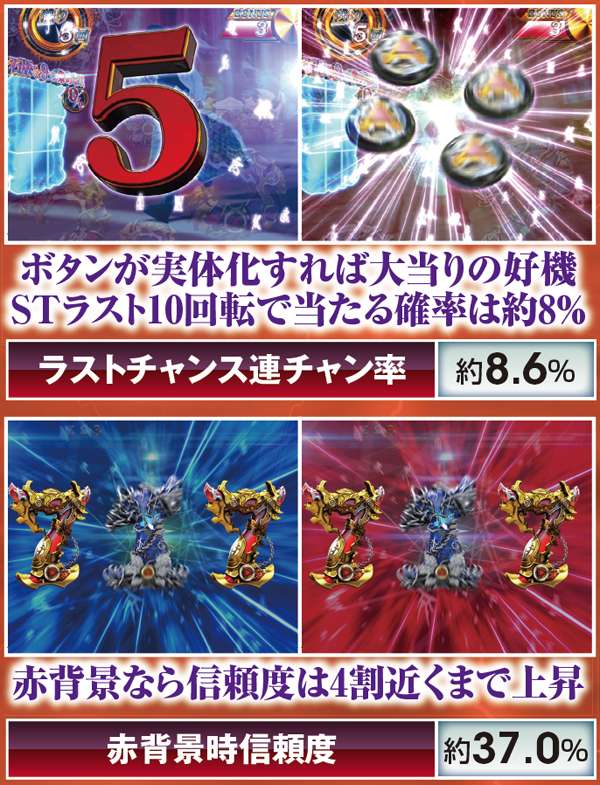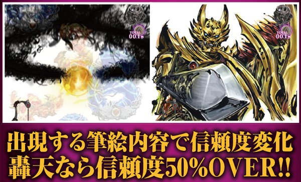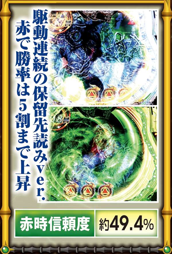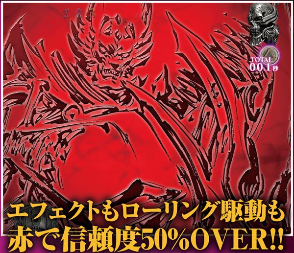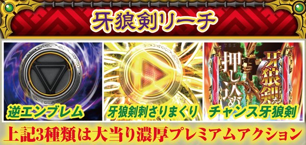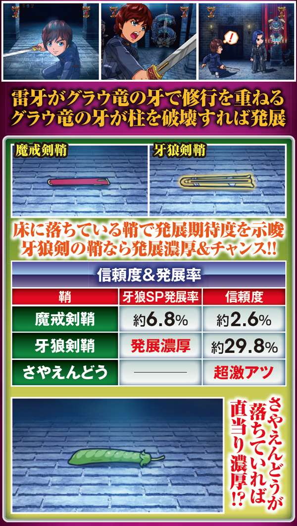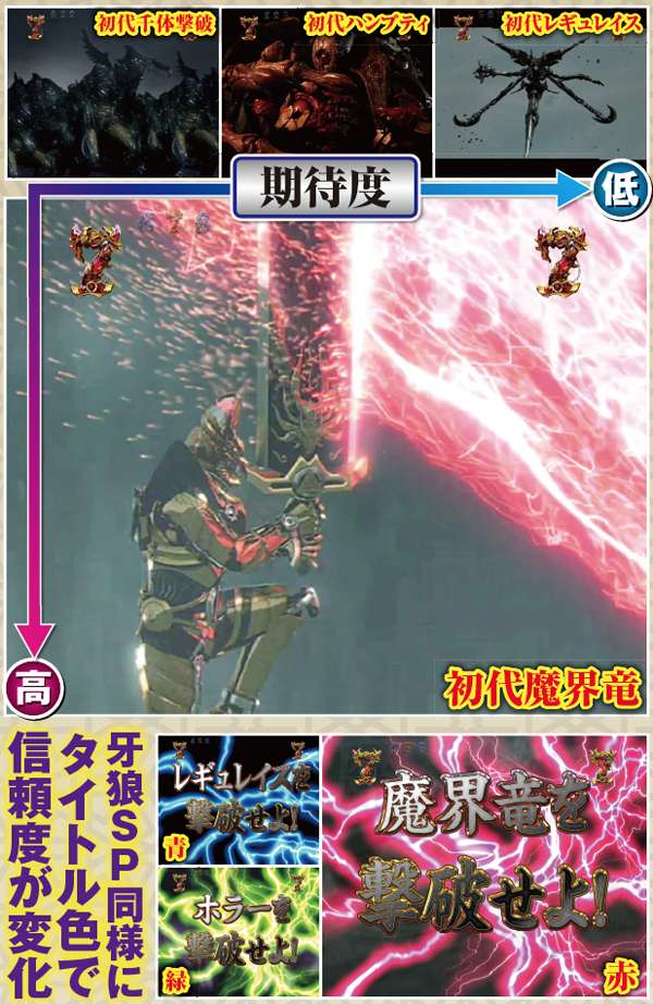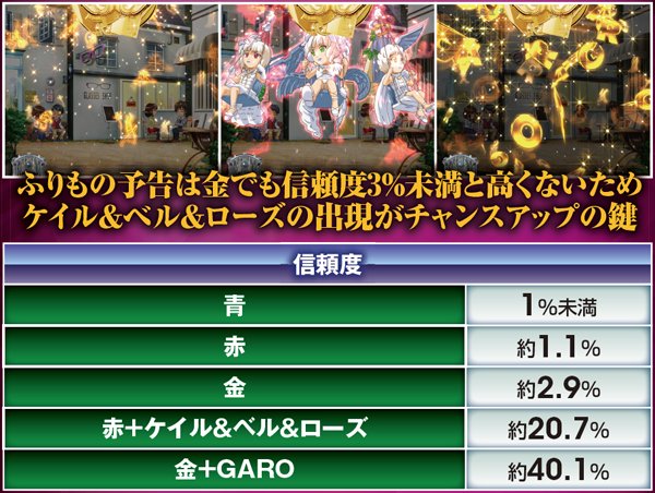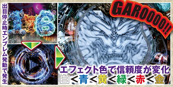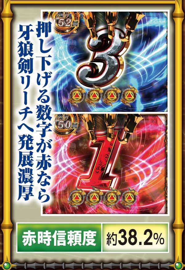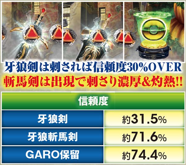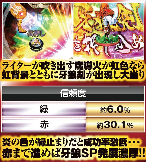 様々な予告途中の魔導刻出現から移行し、発展さえすれば最低でも信頼度7割超となる激アツリーチ。当否決定時の牙狼剣押し込み演出エフェクトで信頼度が変化し、赤なら連チャンは貰ったも同然だ。