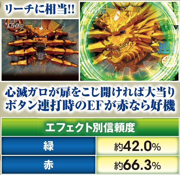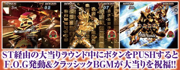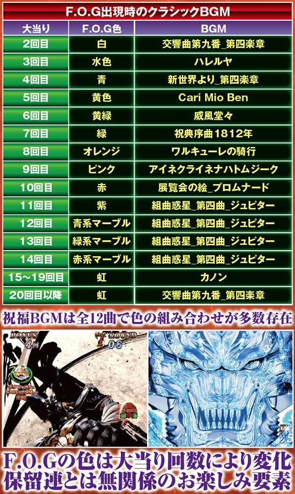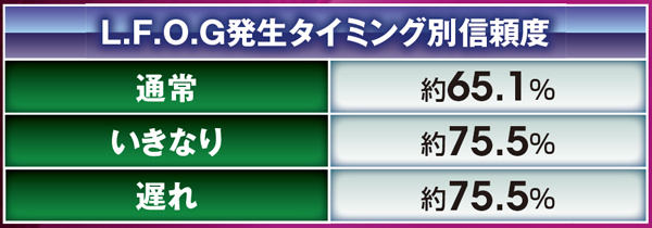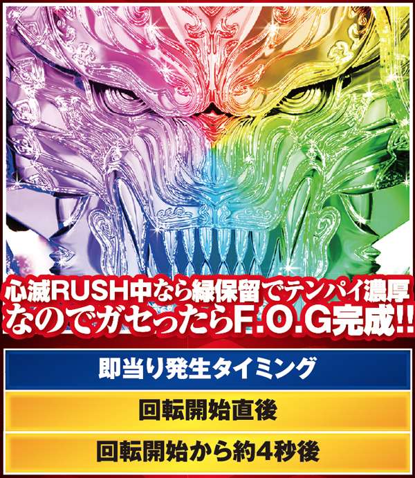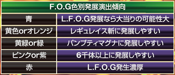 モード中は出っ放しとなるF.O.Gの色がリーチ発展期待度を示唆しており、緑で発展のチャンス、赤で発展濃厚。レインボーなら直当りが濃厚となる。