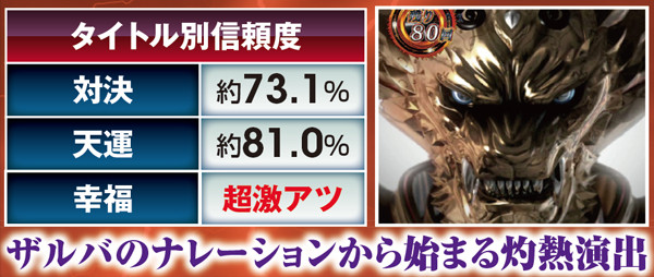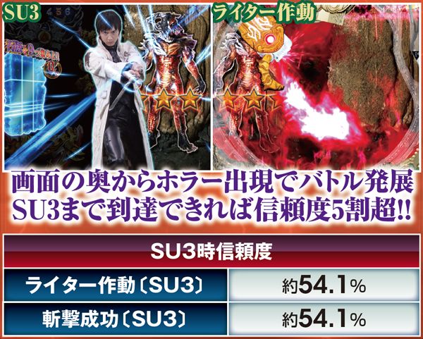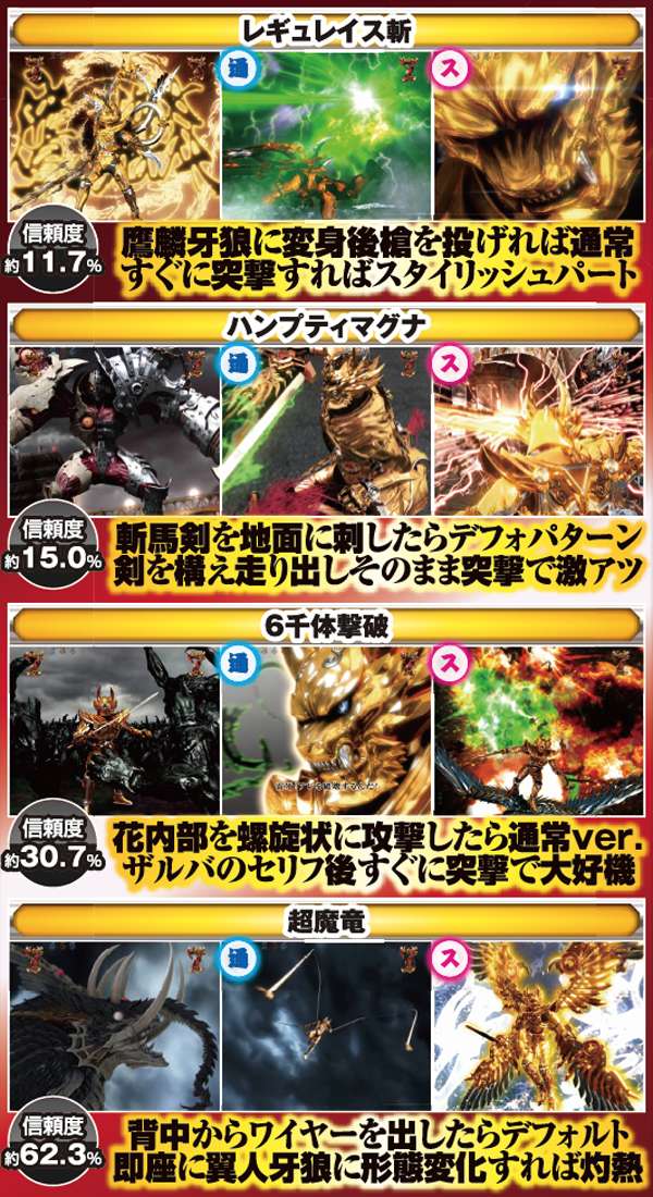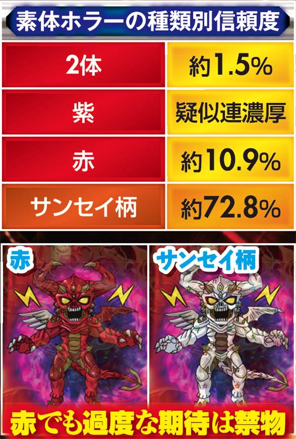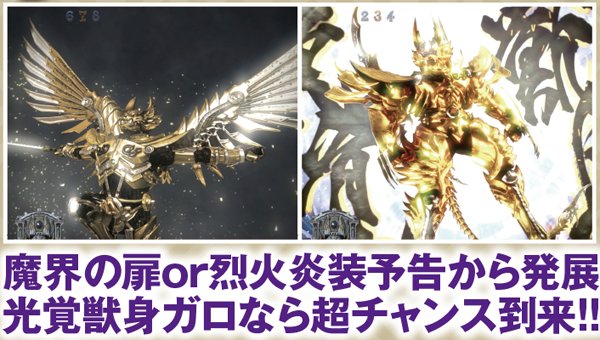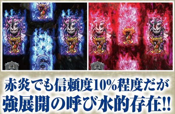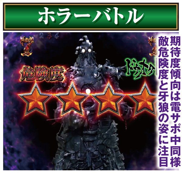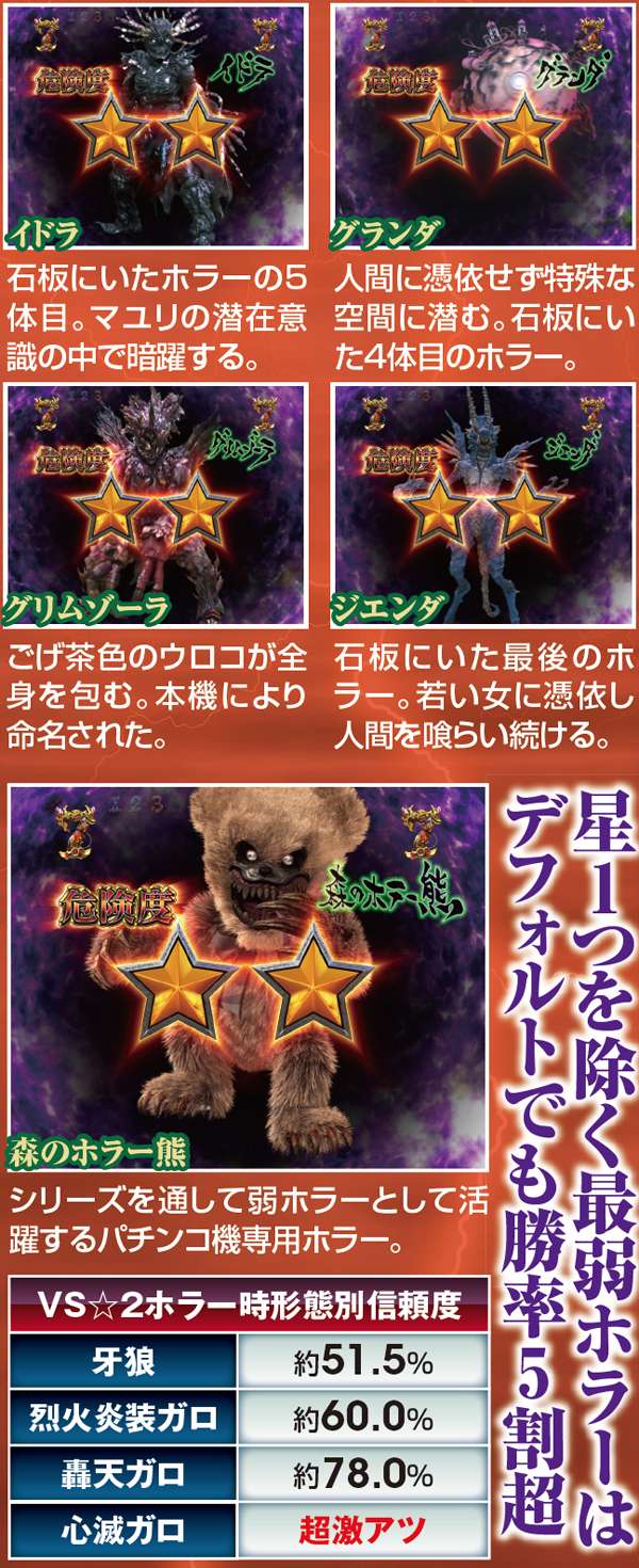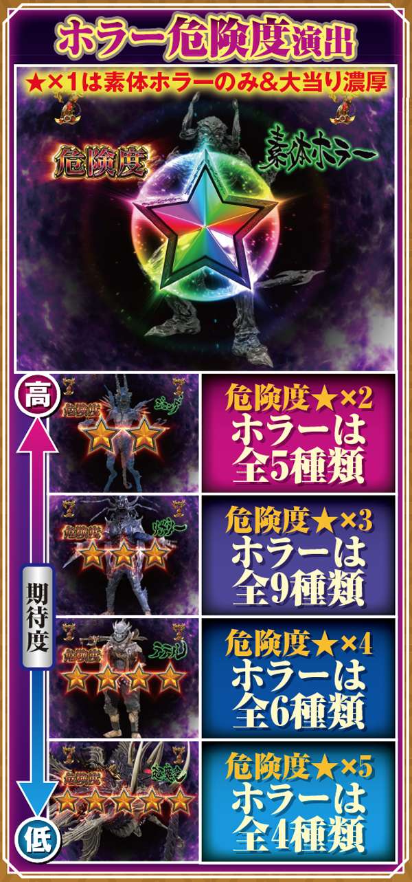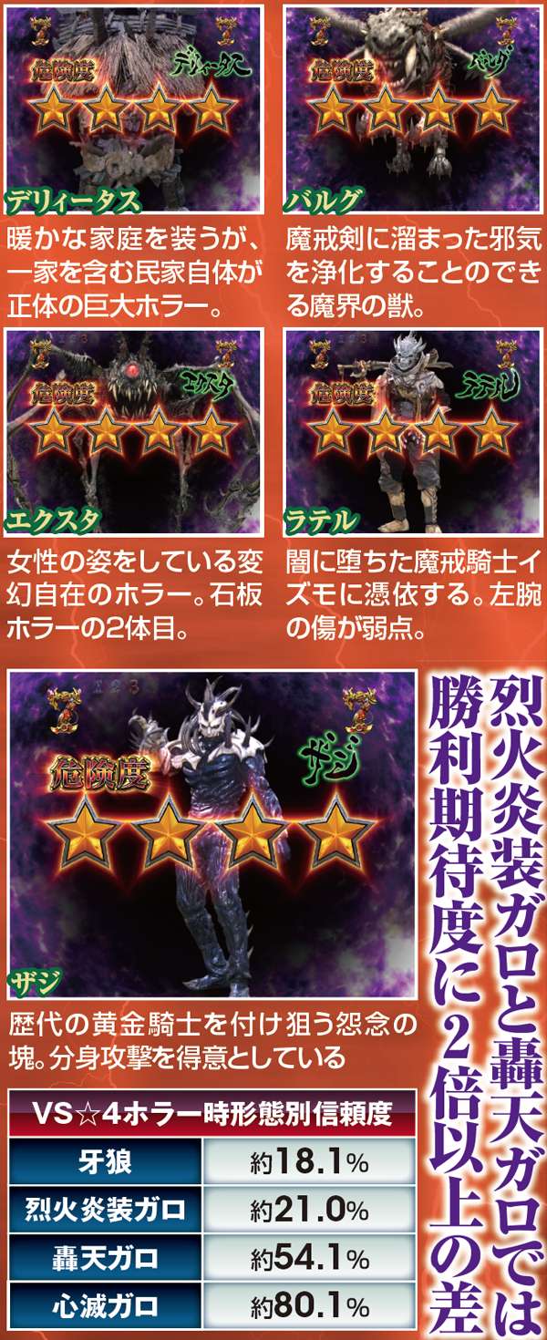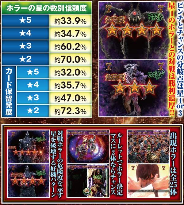 下位2形態でも存分に勝利が見込めるのは星3ホラーまで。逆に上位形態はホラーの星数問わず激アツとなっており、星3ホラーで烈火炎装以下が選択された時こそが真の勝負所となる。