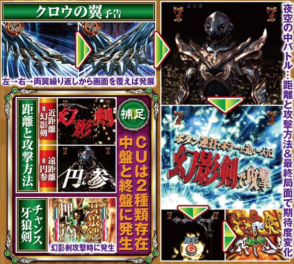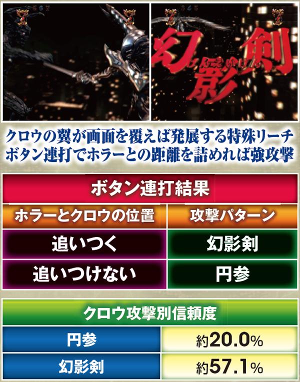 クロウの両翼が画面を覆い尽くせば発展。ホラーに追いつけるか否かで攻撃パターンが変化し、弱攻撃と強攻撃の間には40%弱の信頼度差が存在する。