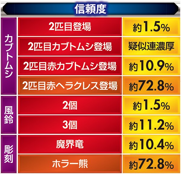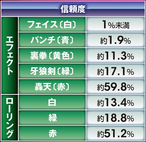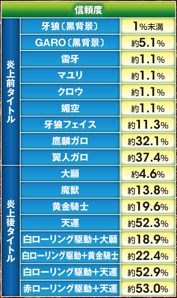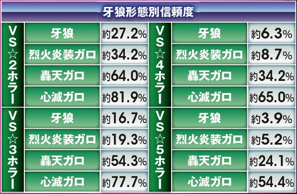 敵ホラーの星数と牙狼の変身形態によって信頼度が変化する、ST中ホラーバトルの通常時版。信頼度の組み合わせは上記の通り。星3以下or轟天以上に期待だ。