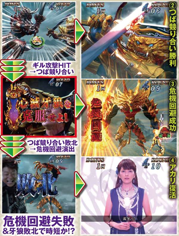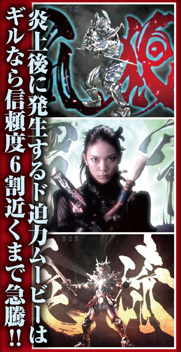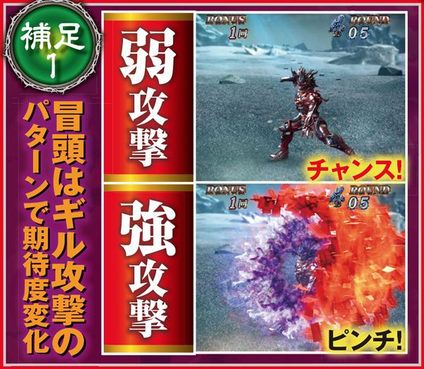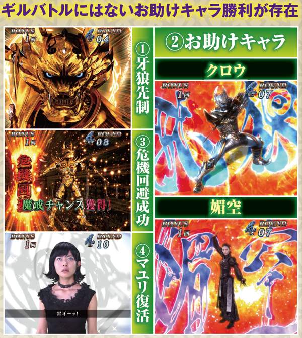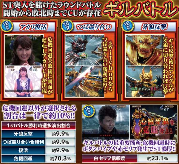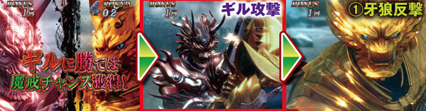 ギルが放つ直前の札攻撃に炎が纏っていると強攻撃につきピンチ。炎を纏わない弱攻撃ならば、その時点でのST期待度が50%にまで跳ね上がる。また、弱攻撃時は牙狼が反撃する勝利濃厚パターンも存在。