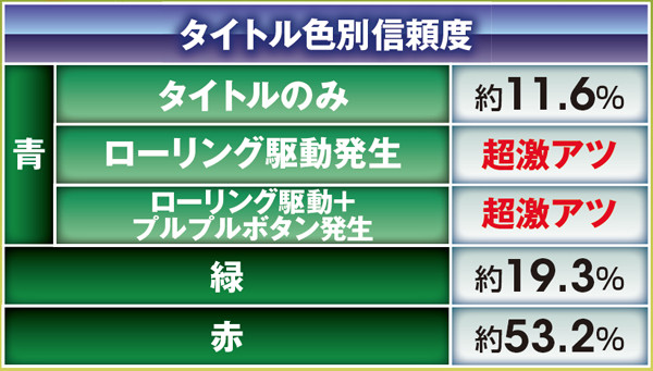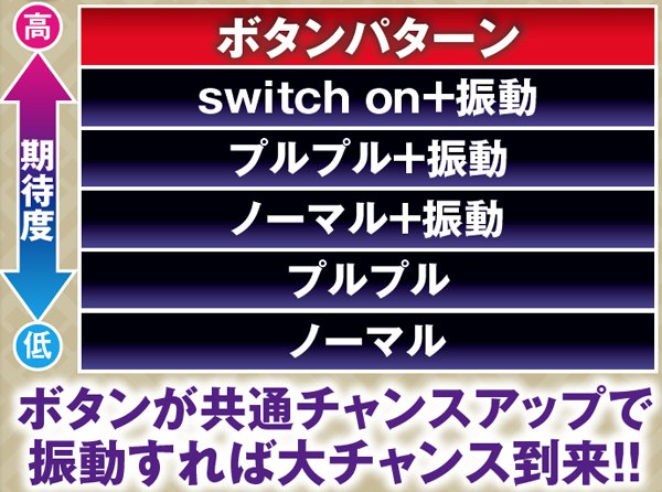 共通チャンスアップであるプルプルボタンは発生か否かで信頼度に2倍近く差が出る。ロングバイブ発生時はボタンPUSHで「キュインッ」と先告知が鳴る場合も。
