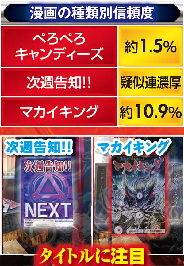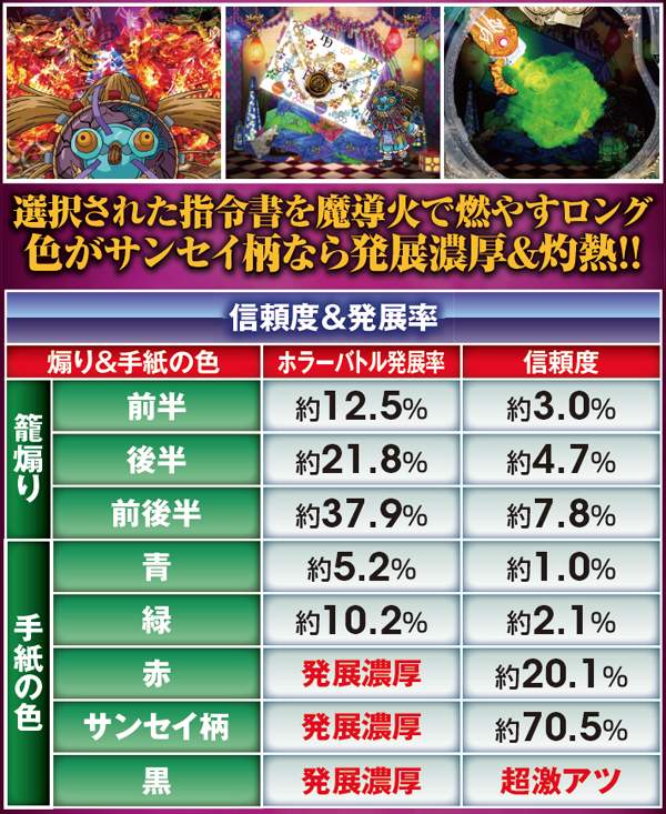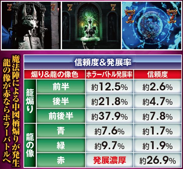 籠煽りは前後半共に発生でホラーバトル発展率4割弱。龍の像は発展濃厚となる赤が出現しないことには発展すらままならない。