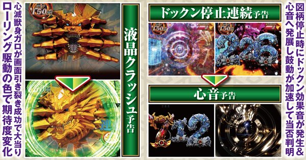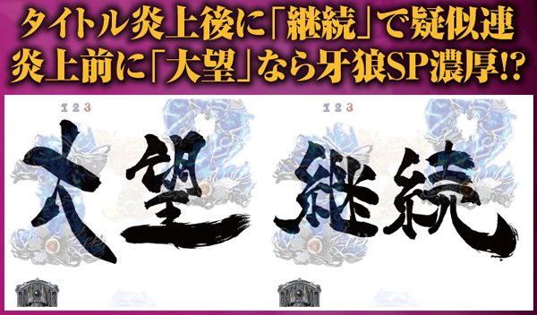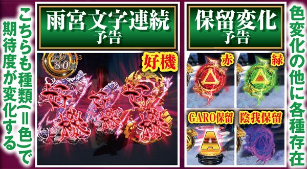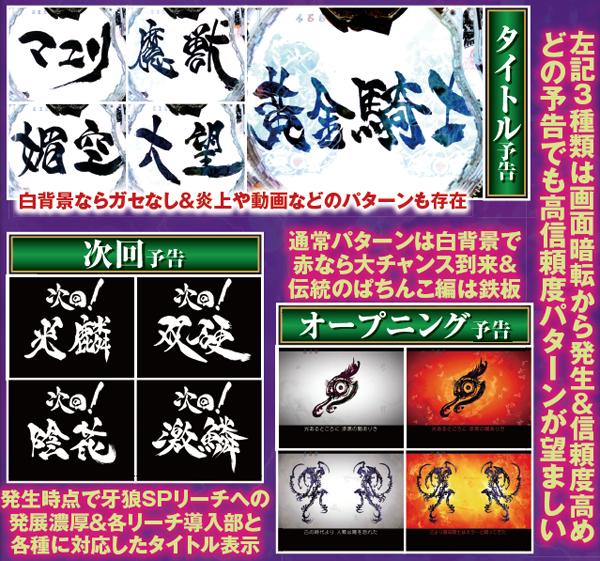 牙狼シリーズの予告の軸を担ってきた牙狼連続予告も雰囲気を残しつつ確実に進化。発生ポイントは各種予告中からテンパイ後まで様々で、その後発生するエフェクト色が期待度を大きく左右する。おなじみの継続文字や、様々な予告で紫エフェクトが出たら疑似連の合図となる。