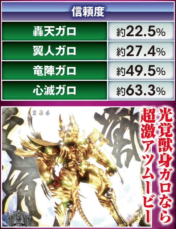 牙狼でも半数が勝利に繋がるハイチャンスパターン。心滅ガロへと形態変化すれば勝利濃厚となるぞ。