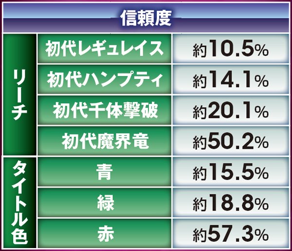 期待度は下からレギュレイス斬<ハンプティマグナ<6千体撃破<超魔竜の順。毎度定番となった竜リーチが特にアツいと推測できるが、今作にもリーチ進行中チャンスアップが随所に存在するため、下位リーチでも気が抜けない仕様だ。
