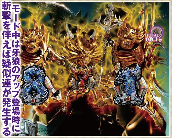 突入すると図柄が専用のモノに変化&高期待度となる背景変化予告。インパクト牙狼停止予告なるモード専用演出を経て図柄が停止し、斬撃が発生すれば疑似連へ、発生しなければ牙狼SPリーチへとそれぞれ発展する。